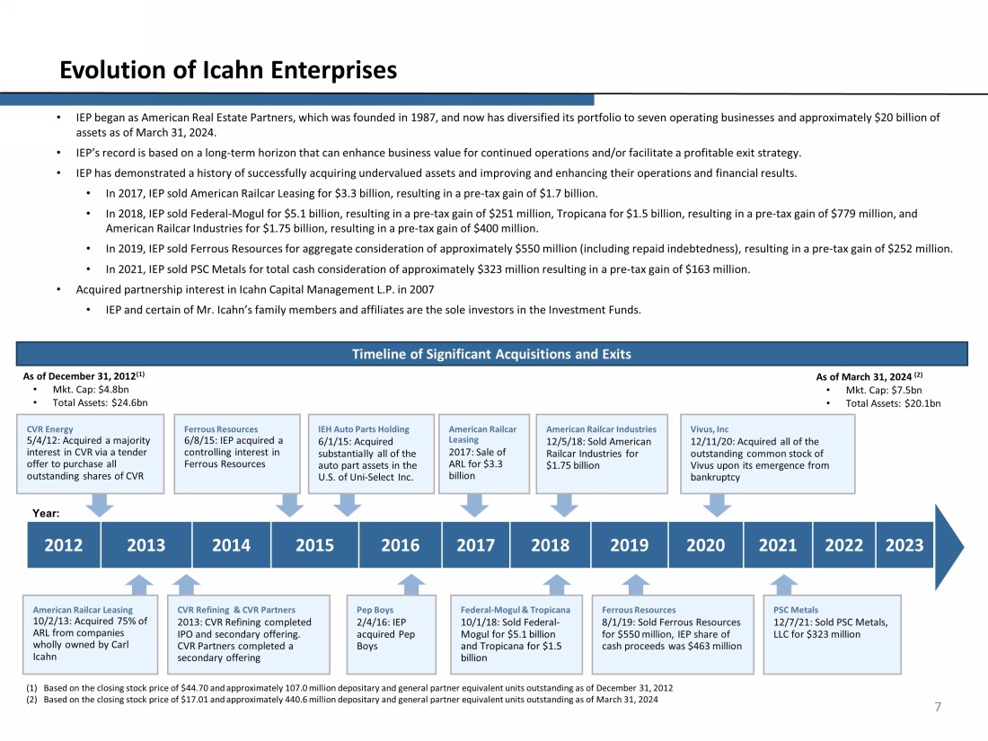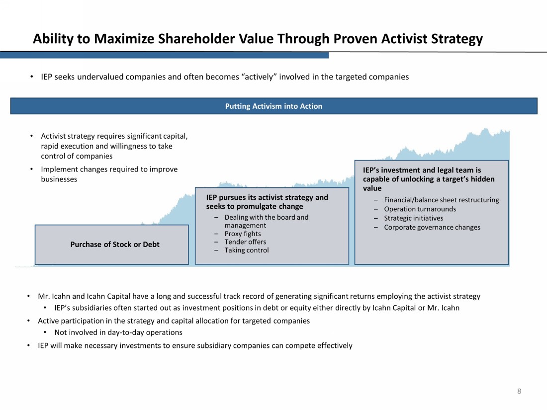 7 伊坎企业 • IEP的演变始于美国房地产合作伙伴公司,该公司成立于1987年,截至2024年3月31日,现已将其投资组合多元化至七项可运营的ng业务和约200亿美元的资产。• IEP的记录基于长期视野,可以提高持续经营的业务价值和/或促进可盈利的退出战略。• IEP已经展示了成功收购被低估资产并改善和增强其运营和财务业绩的历史。• 2017年,IEP以33亿美元的价格出售了American Railcar Leasing,产生了17亿美元的税前收益。• 2018年,IEP以51亿美元出售Federal-Mogul,产生2.51亿美元的税前收益,Tropicana以15亿美元出售,Resul Ting以7.79亿美元的税前收益出售,美国有轨车工业以17.5亿美元的税前收益出售,产生4亿美元的税前收益。• 2019年,IEP出售Ferrous Resources,总对价约为5.5亿美元(包括已偿还的债务),从而产生2.52亿美元的税前收益。• 2021年,IEP以约3.23亿美元的总现金对价出售PSC Metals,产生163美元的税前收益mill ion。•于2007年获得Icahn Capital Management L.P.的合伙权益• IEP和Icahn先生的某些家庭成员和关联公司是投资基金的唯一投资者。重大收购和退出时间表(1)基于2012年12月31日收盘价44.70美元和约1.070亿个存托和普通合伙人等值单位的未偿A s(2)基于17.01美元的收盘价和约4.406亿个存托和普通合伙人等值单位的截至2024年3月31日的未偿截至2012年12月31日(1)• MKT。上限:48亿美元•总资产:截至2024年3月31日为246亿美元(2)• MKT。上限:7.5b美元n •总资产:201亿美元年份:20122032014201520162017201820192020202120222023 American Railcar Leasing 10/2/13:从Carl Icahn Ferrous Resources全资拥有的公司收购75%的ARL 6/8/15:IEP收购Ferrous Resources的控股权Pep Boys 2/4/16:IEP收购Pep Boys Federal-Mogul & Tropicana 10/1/18:以51亿美元出售Federal-Mogul,以15亿美元出售Tropicana Ferrous Resources 8/1/19:以5.5亿美元出售Ferrous Resources,IEP现金收益份额为4.63亿美元PSC Metals 12/7/21:以3.23亿美元出售PSC Metals,LLC CVR能源 5/4/12:通过要约收购方式获得CVR的多数股权,以购买CVRCVRTERM4 Refining & CVR合伙人的所有流通股2013:CVR Refining完成IPO和二次发行。CVR合伙人完成二次发行IEH Auto Parts Holding 6/1/15:收购Uni-Select Inc.在美国的几乎所有汽车零部件资产American Railcar Leasing 2017:以30亿美元出售ARL美国有轨车工业 vivus,Inc 12/11/20:在vivus摆脱破产保护后收购其所有已发行在外的普通股
