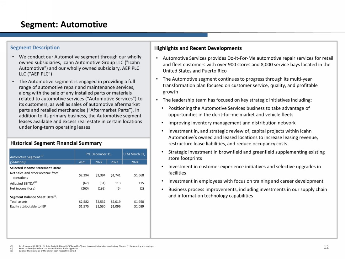 亮点和近期发展•汽车服务为零售和车队客户提供Do-IT-For-Me汽车维修服务,在美国和波多黎各拥有超过900家商店和8,000个服务舱•汽车部门继续通过其多年转型计划取得进展,重点关注客户服务、质量、和盈利增长•领导团队专注于关键战略举措,包括:•将汽车服务业务定位于利用do-IT for me市场和车队的机会•改善库存管理和分销网络•对Icahn Automotive自有和租赁地点内的资本项目进行投资和战略审查,以增加租赁收入、重组租赁负债,并降低占用成本•对棕地和绿地进行战略投资以补充现有门店足迹•对客户体验计划和设施选择性升级进行投资•对员工进行投资,重点是培训和职业发展•业务流程改进,包括对我们的供应链和信息技术能力进行投资分部说明•我们通过我们的全资子公司Icahn Automotive Group LLC(“Icahn Automotive”)和我们的全资子公司AEP PLC LLC(“AEP PLC”)开展我们的汽车分部•汽车分部从事提供全方位的汽车维修和保养服务,向其客户销售与汽车服务(“汽车服务”)相关的任何已安装零件或材料,以及销售汽车后市场零件和零售商品(“后市场零件”)。除主要业务外,汽车部门根据长期经营租赁在某些地点租赁可用和多余的房地产12部门:汽车历史部门财务摘要(1)截至2023年1月31日,IEH Auto Parts Holdings LLC(“Auto Plus”)因自愿第11章破产程序roc程序而被取消合并。(2)参考附录中的调整后EBITDA对账。(三)截至各期末的资产负债表数据。(百万美元)2021年部分损益表数据:净销售额和其他运营收入2,394美元2,394美元1,741美元1,668美元调整后EBITDA(2)(67)(31)113115净收入(亏损)(260)(192)(6)(2)分部资产负债表数据(3):总资产2,582美元2,532美元2,0 19美元1,958美元归属于IEP的权益1,575美元1,530美元1,096美元1,089美元AAA(1)FYE December 31,LTM March 31,202420222023