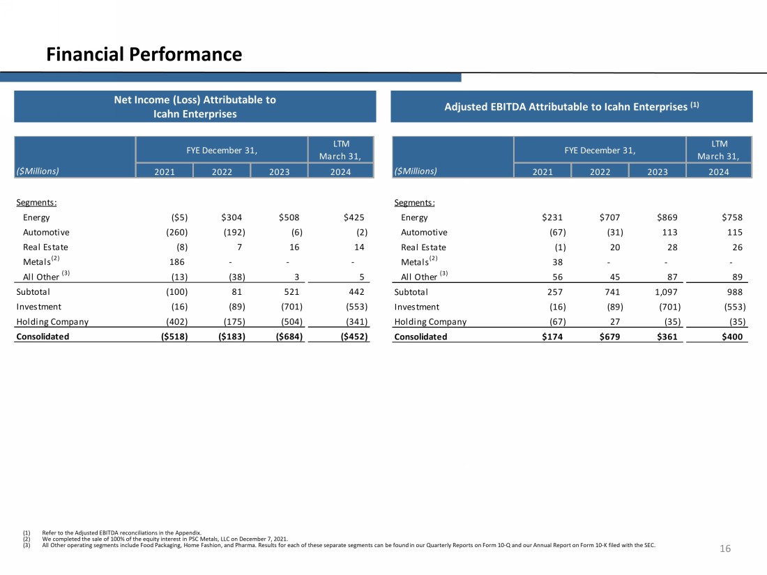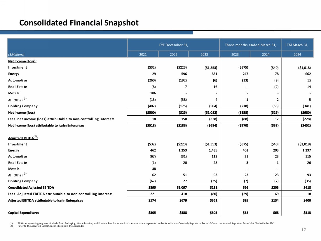 16财务业绩归属于伊坎企业的净利润(亏损)调整后归属于伊坎企业的EBITDA(1)(1)请参阅附录中的调整后EBITDA对账。(2)我们于2021年12月7日完成出售PSC Metals,LLC的100%股权。(3)其他经营板块包括食品包装、家居时尚、医药。在我们提交给SEC的10-Q表格季度报告和10-K表格年度报告中可以找到这些单独部分的结果。(百万美元)部分:能源(5美元)304美元508美元425汽车(260)(192)(6)(2)房地产(8)71614金属(2)186---所有其他(3)(13)(38)35小计(100)81521442投资(16)(89)(701)(553)控股公司(402)(175)(504)(341)合并(518美元)(183美元)(684美元)(452美元)财年12月31日,LTM 3月31日,2021202220232024(百万美元)分部:能源231美元707美元869美元758美元汽车(67)(31)113115房地产(1)202826金属(2)38----所有其他(3)56458789小计2577411,097988投资(16)(89)(701)(553)控股公司(67)27(35)(35)综合174美元679美元361美元400美元2024长期投资管理标准2021年3月31日2021年12月31日20222023