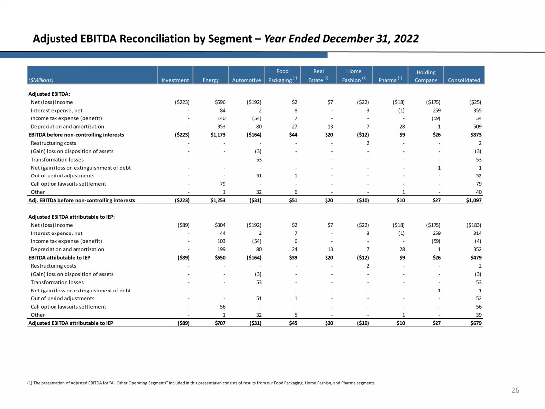 25按分部划分的调整后EBITDA调节–截至2023年12月31日止年度(1)本演示文稿中包含的“所有其他经营分部”的调整后EBITDA列报包括我们的食品包装、家居时尚和制药分部的业绩。净(亏损)收入(1,353)831(6)1316(6)(3)(504)($ 1,012)利息支出,净额-52-12-1(1)189253所得税费用(收益)-189(10)4----(93)90折旧和摊销-3638125137281518($ 1,353)$ 1,435 $ 65 $ 54 $ 29 $ 2 $ 24($ 407)($ 151)减值--7-----7关联方应收票据信用损失-------139139分拆子公司损失-------246246重组费用-----1--1(收益)资产处置损失,净--(10)-----(10)转型成本--41----41债务清偿净(收益)损失-----(13)(13)期外调整--10-----10其他----11(1)-1-11($ 1,353)$ 1,435 $ 113 $ 65 $ 28 $ 3 $ 25($ 35)$ 281净(亏损)收入(701)508(6)1216(6)(3)(504)($ 684)利息支出,净额-24-11-1(1)189224所得税费用(收益)-135(10)4----(93)36折旧和摊销-2028122137281354($ 701)$ 869 $ 65 $ 49 $ 29 $ 2 $ 24($ 407)($ 70)减值--7-----7关联方应收票据信用损失-------139139分拆子公司损失-------246246重组费用-----1--1(收益)资产处置损失,净--(10)-----(10)转型成本--41-----41债务清偿净(收益)损失------(13)(13)期外调整--10-----10其他----10(1)-1-10($ 701)$ 869 $ 113 $ 59 $ 28 $ 3 $ 25($ 35)$ 361 EBITDA before non-controlling interests adj. EBITDA归属于IEP的调整后EBITDA归属于IEP的调整后EBITDA:归属于IEP的EBITDA调整后EBITDA:(百万美元)Investment Energy Automotive Food Packaging(1)Holding Company Consolidated Real Estate Home Fashion(1)Pharma(1)