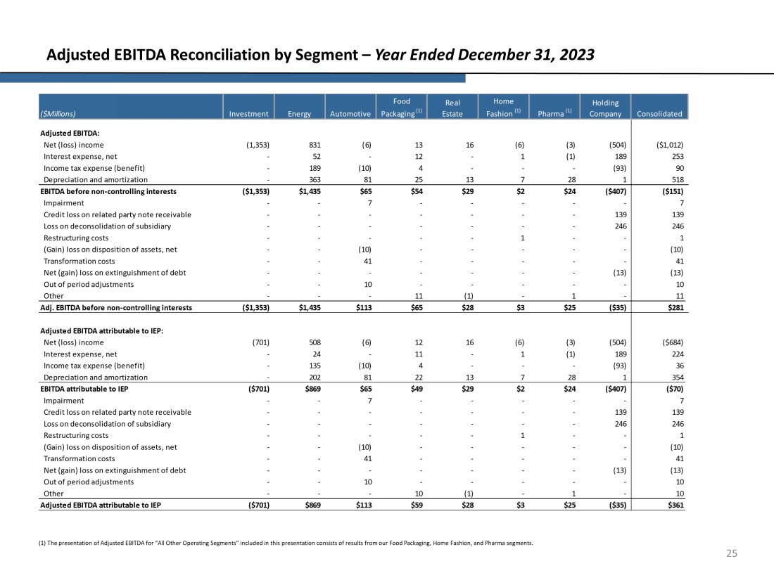 24按分部划分的调整后EBITDA调节–截至2023年3月31日止三个月(1)本演示文稿中包含的“所有其他经营分部”的调整后EBITDA列报包括我们食品包装、家居时尚和制药分部的业绩。净(亏损)收入(375)247(13)7-(2)(4)(218)(358美元)利息支出,净额-18-3---4970所得税费用(收益)-52-(4)---(64)(16)折旧和摊销-84197327-122($ 375)$ 401 $ 6 $ 13 $ 3 $ 0 $ 3($ 233)($ 182)分拆子公司的损失-------226226转型成本---9-----9期外调整---6-----6其他---7---7($ 375)$ 401 $ 21 $ 20 $ 3 $ 0 $ 3($ 7)$ 66净(亏损)收入(171)132(13)6-(2)(4)(218)($ 270)利息支出,净额-10-3---4962所得税费用(收益)-38-(4)---(64)(30)折旧和摊销-49196327-86($ 171)$ 229 $ 6 $ 11 $ 3 $ 0 $ 3($ 233)($ 152)分拆子公司的损失--------226226转型成本-------9期外调整---6------6其他---6-----6($ 171)$ 229 $ 21 $ 17 $ 3 $ 0 $ 3($ 7)$ 95 EBITDA before non-controlling interests adj. EBITDA归属于IEP的调整后EBITDA归属于IEP的调整后EBITDA:归属于IEP的EBITDA调整后EBITDA:(百万美元)Investment Energy Automotive Food Packaging(1)Holding Company Consolidated Real Estate Home Fashion(1)Pharma(1)