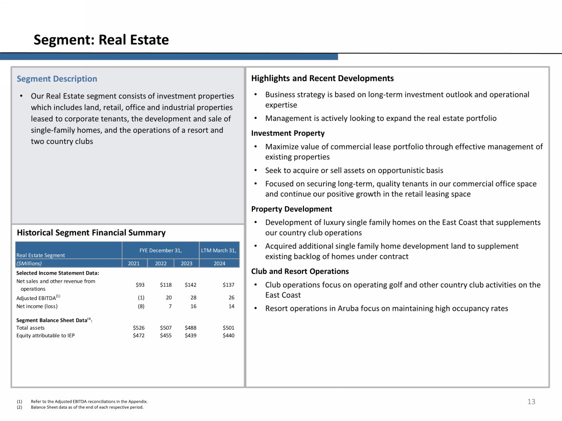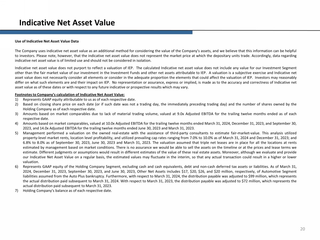 20指示性净资产值使用指示性净资产值数据公司使用指示性净资产值作为考虑公司资产价值的附加方法,我们认为这些信息可以对投资者有所帮助。但请注意,指示性资产净值并不代表存托单位交易的市场价格。因此,有关指示性资产净值的数据用途有限,不应孤立考虑。指示性资产净值并不旨在反映IEP的估值。计算出的指示性净资产值不包括除我们投资于投资基金的公允市场价值和归属于IEP的其他净资产之外的我们投资分部的任何价值。估值是一种主观练习,指示性资产净值不一定会考虑所有要素,也不一定会以适当的比例考虑可能影响IEP估值的要素。投资者可能对这些要素是什么以及它们对IEP的影响存在合理的分歧。对于截至这些日期的指示性资产净值的准确性和正确性,或对于任何可能变化的未来指示性或前瞻性结果,不作任何明示或暗示的陈述或保证。公司计算指示性资产净值的脚注:1)表示在每个相应日期归属于我们的GAAP权益。2)根据每个日期的收市股价(或如该日期并非交易日,则为紧接的前一个交易日)及控股公司于各有关日期拥有的股份数目。3)金额基于市场可比因缺乏材料交易量,估值为9。0 x截至每个相应日期的过去十二个月的调整后EBITDA。4)金额基于市场可比数据,估值为10。0 x截至2024年3月31日、2023年12月31日、2023年9月30日和14日的过去12个月的调整后EBITDA。0 x截至2023年6月30日和2023年3月31日的过去12个月的调整后EBITDA。5)管理层在第三方顾问协助下对自有房地产进行估值,以估计公平市场价值。该分析利用了物业层面的市场租金、位置层面的盈利能力,并利用了现行的上限利率,范围从7。0%至10。截至2024年3月31日及2023年12月31日为0%;及6。8%至8。截至2023年9月30日、2023年6月30日及2023年3月31日为0%。估值假设所有地点的三重净租赁均已到位,租金由管理层根据市场情况估算。无法保证我们能够在时间表上或以我们估计的价格和租赁条款出售资产。不同的判断或假设将导致对这些房地产资产价值的不同估计。此外,尽管我们定期评估并提供我们的指示性资产净值,但估计值可能会在中期波动,因此任何实际交易都可能导致更高或更低的估值。6)代表控股公司部门的GAAP权益,不包括现金和现金等价物、债务和非现金递延所得税资产或负债。截至2024年3月31日、2023年12月31日、2023年9月30日和2023年6月30日,其他净资产分别包括从Auto Plus破产中承担的汽车板块负债17美元、20美元、26美元和2000万美元。此外,关于2024年3月31日,应付分配款调整为9900万美元,即2024年3月31日之后实际支付的分配款。关于2023年3月31日,应付分配款调整为7200万美元,即2023年3月31日之后实际支付的分配款。7)控股公司截至各相关日期的余额。
