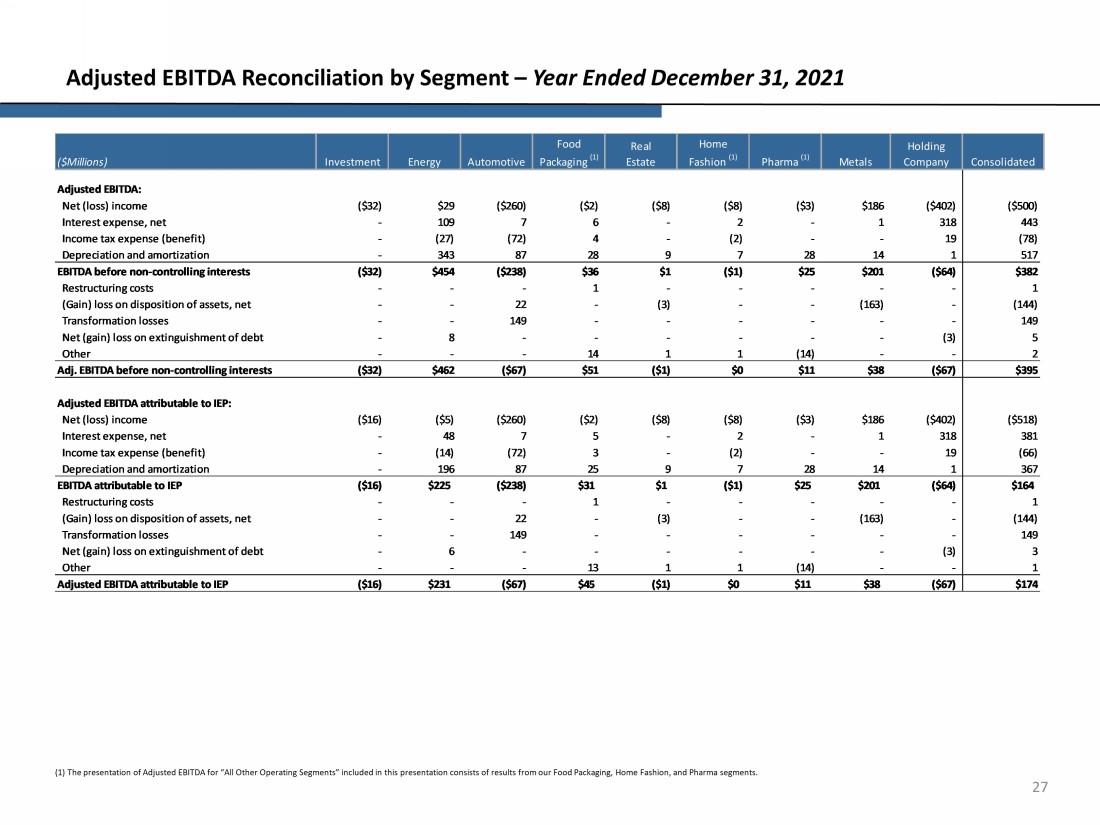 26按分部划分的调整后EBITDA调节–截至2022年12月31日止年度(1)本演示文稿中包含的“所有其他经营分部”的调整后EBITDA列报包括我们的食品包装、家居时尚和制药分部的业绩。净(亏损)收入(223美元)596美元(192美元)2美元7美元(22美元)(18美元)(175美元)(25美元)利息支出,净额-8428-3(1)259355所得税费用(收益)-140(54)7----(59)34折旧和摊销-3538027137281509($ 223)$ 1,173($ 164)$ 44 $ 20($ 12)$ 9 $ 26 $ 873重组成本-----2--2(收益)资产处置损失---(3)-----(3)转型损失--53----53债务清偿净(收益)损失-------11期外调整---511----52看涨期权诉讼和解-79---------79其他-1326--1-40($ 223)$ 1,253($ 31)$ 51 $ 20($ 10)$ 10 $ 27 $ 1,097净(亏损)收入($ 89)$ 304($ 192)$ 2 $ 7($ 22)($ 18)($ 175)($ 183)利息支出,净额-4427-3(1)259314所得税费用(收益)-103(54)6---(59)(4)折旧和摊销-1998024137281352($ 89)$ 650($ 164)$ 39 $ 20($ 12)$ 9 $ 26 $ 479重组成本-----2--2(收益)资产处置损失---(3)----(3)转型损失--53-----53债务清偿净(收益)损失-------11期外调整---511----52看涨期权诉讼和解-56--------56其他-1325--1-39($ 89)$ 707($ 31)$ 45 $ 20($ 10)$ 10 $ 27 $ 679 Home Fashion(1)Pharma(1)Investment Energy Automotive Food Packaging(1)Real Estate(1)($ millions)Holding Company合并调整后EBITDA:扣除非控股权益后的EBITDA归属于IEP的调整后EBITDA:调整后的EBITDA扣除非控股权益后的EBITDA归属于IEP的调整后EBITDA