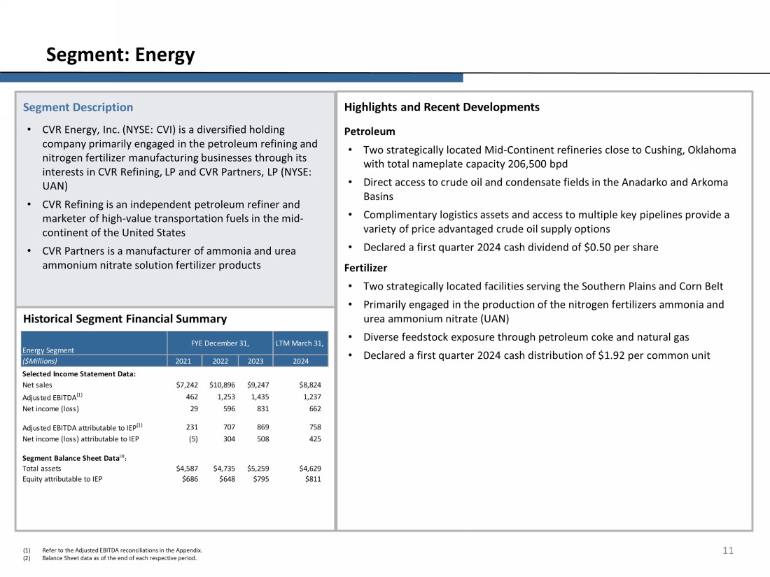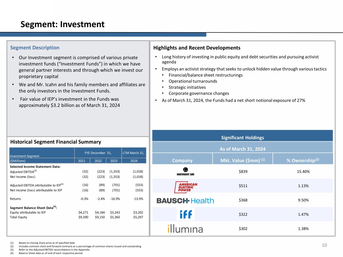 亮点和近期发展•长期投资于公共股权和债务证券并追求激进主义议程•采用寻求通过各种策略释放隐藏价值的激进主义战略•财务/资产负债表重组•运营转变•战略举措•公司治理变化•截至2024年3月31日,这些基金的净空头名义敞口为27%分部说明•我们的投资分部由我们拥有普通合伙人权益的各种私人投资基金(“投资基金”)组成,我们通过这些基金投资我们的专有资本•我们和伊坎先生及其家庭成员和关联公司是投资基金的唯一投资者。•截至2024年3月31日,IEP对这些基金的投资的公允价值约为32亿美元10分部:投资历史分部财务摘要(1)基于截至指定日期的收盘股价。(2)包括普通股和远期合约,占已发行和流通普通股的百分比。(3)参考附录中的调整后EBITDA对账。(四)截至各期末的资产负债表数据。截至2024年3月31日的重要持股公司MKT。价值($ mm)(1)%所有权(2)$ 83915.40% $ 5111.13% $ 3689.50% $ 3221.47% $ 3021.38%(百万美元)2021选定损益表数据:调整后EBITDA(3)(32)(223)(1,353)(1,018)净收入(亏损)(32)(223)(1,353)(1,018)调整后归属于IEP的EBITDA(3)(16)(89)(701)(553)归属于IEP的净利润(亏损)(16)(89)(701)(553)回报率-0.3 %-2.4 %-16.9 %分部资产负债表数据(4):归属于IEP的权益$ 4,271 $ 4,184 $ 3,243 $ 3,202总权益$ 9,20242022 2023