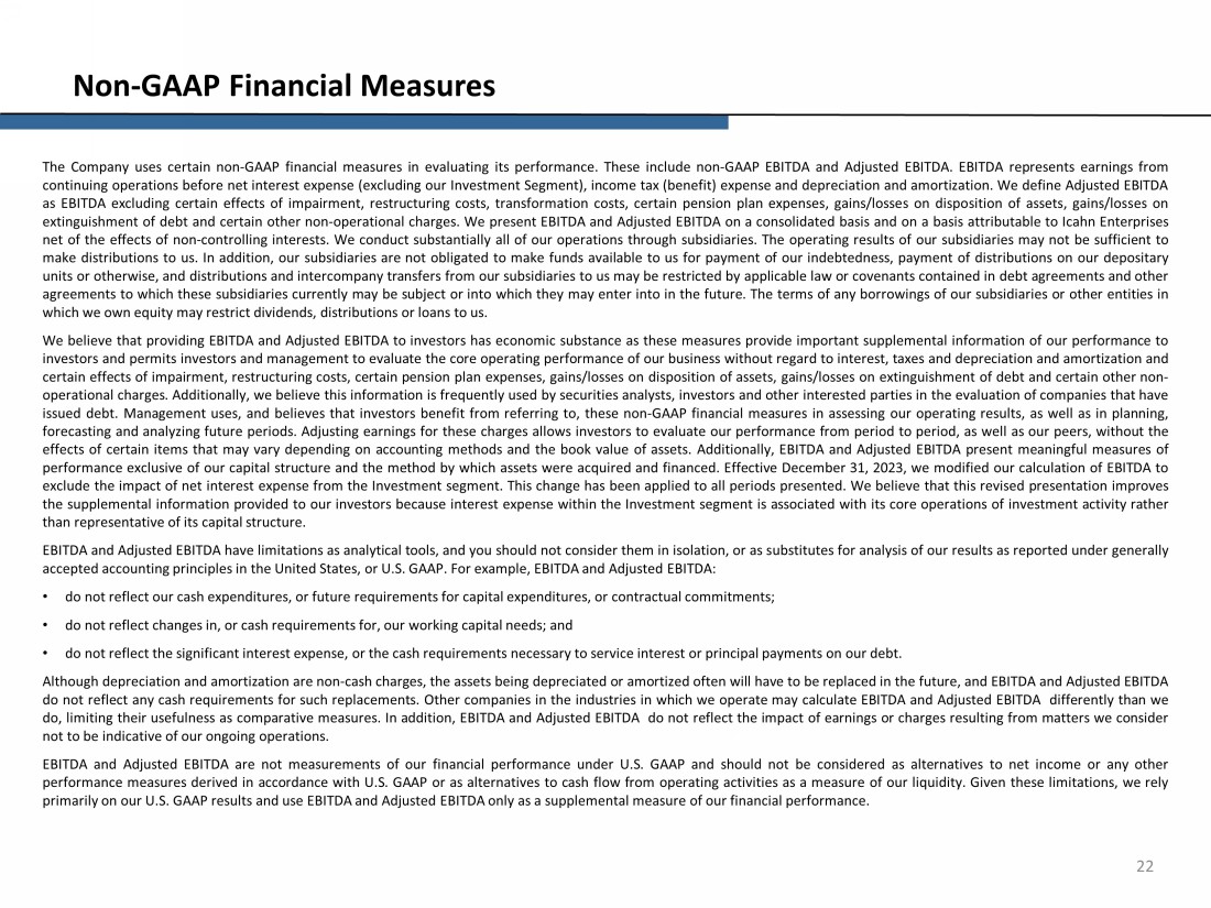 22 Non-GAAP财务指标公司在评估业绩时使用了某些Non-GAAP财务指标。其中包括非公认会计准则EBITDA和调整后EBITDA。EBITDA代表扣除净利息支出(不包括我们的投资部门)、所得税(福利)支出以及折旧和摊销前的持续经营收益。我们将调整后EBITDA定义为不包括减值、重组成本、转型成本、某些养老金计划费用、资产处置损益、债务清偿损益和某些其他非运营费用的某些影响的EBITDA。我们在综合基础上以及在扣除非控股权益影响后归属于伊坎企业的基础上呈报EBITDA和调整后EBITDA。我们基本上所有的业务都是通过子公司进行的。我们附属公司的经营业绩可能不足以向我们作出分配。此外,我们的子公司没有义务向我们提供资金,用于支付我们的债务、支付我们的存托单位的分配或其他方面,并且从我们的子公司向我们进行的分配和公司间转移可能受到适用法律或这些子公司目前可能受制于或未来可能订立的债务协议和其他协议中包含的契约的限制。我们的子公司或我们拥有股权的其他实体的任何借款的条款可能会限制向我们的股息、分配或贷款。我们认为,向投资者提供EBITDA和调整后EBITDA具有经济实质,因为这些措施为投资者提供了我们业绩的重要补充信息,并允许投资者和管理层评估我们业务的核心经营业绩,而不考虑利息、税收和折旧摊销以及减值、重组成本、某些养老金计划费用、资产处置损益、债务清偿损益和某些其他非运营费用的某些影响。此外,我们认为证券分析师、投资者和其他利益相关方在评估已发债公司时经常使用这些信息。管理层在评估我们的经营业绩以及在规划、预测和分析未来期间时使用并相信投资者可以从参考这些非公认会计准则财务指标中受益。调整这些费用的收益使投资者能够评估我们不同时期的业绩,以及我们的同行,而不会受到某些项目的影响,这些项目可能会因会计方法和资产的账面价值而有所不同。此外,EBITDA和调整后EBITDA提供了有意义的业绩衡量标准,不包括我们的资本结构以及收购和融资资产的方法。自2023年12月31日起,我们修改了对EBITDA的计算,以排除投资部分的净利息支出的影响。这一变化已适用于所有呈报期间。我们认为,这一修订后的列报方式改进了向我们的投资者提供的补充信息,因为投资部门内的利息支出与其投资活动的核心业务相关,而不是代表其资本结构。EBITDA和调整后EBITDA作为分析工具存在局限性,您不应孤立地考虑它们,或作为根据美国公认会计原则或美国公认会计原则报告的我们结果分析的替代品。例如,EBITDA和调整后EBITDA:•不反映我们的现金支出,或资本支出的未来需求,或合同承诺;•不反映我们的营运资金需求的变化或现金需求;•不反映重大的利息支出,或偿还我们债务的利息或本金所需的现金需求。虽然折旧和摊销是非现金费用,但被折旧或摊销的资产往往需要在未来进行置换,EBITDA和调整后EBITDA不反映此类置换的任何现金需求。我们经营所在行业的其他公司计算EBITDA和调整后EBITDA的方式可能与我们不同,从而限制了它们作为比较衡量标准的有用性。此外,EBITDA和调整后EBITDA并未反映我们认为不代表我们持续运营的事项所产生的收益或费用的影响。EBITDA和调整后EBITDA不是衡量我们在美国公认会计原则下的财务业绩,不应被视为净收入或根据美国公认会计原则得出的任何其他业绩衡量标准的替代方案,或作为衡量我们流动性的经营活动现金流的替代方案。鉴于这些限制, 我们主要依赖我们的美国公认会计原则结果,仅使用EBITDA和调整后EBITDA作为我们财务业绩的补充衡量标准。