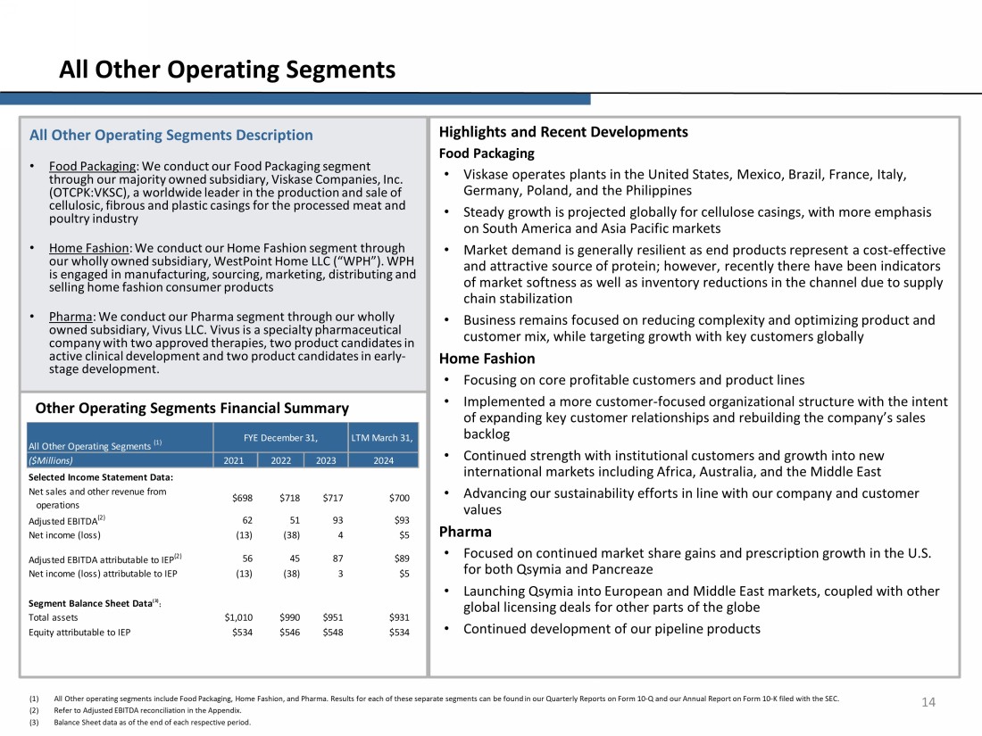 亮点和近期发展•业务战略基于长期投资前景和运营专长•管理层正积极寻求扩大房地产组合投资物业•通过有效管理现有物业实现商业租赁组合价值最大化•寻求在机会主义基础上收购或出售资产•专注于确保长期、我们商业办公空间的优质租户,并继续我们在零售租赁空间的积极增长物业发展•在东海岸开发豪华单户住宅,补充我们的乡村俱乐部运营•获得额外的单户住宅开发土地,以补充现有的合同俱乐部和度假村运营积压的房屋•俱乐部运营专注于在东海岸运营高尔夫和其他乡村俱乐部活动•阿鲁巴的度假村运营专注于保持高出租率分部说明•我们的房地产分部包括投资物业,包括土地、零售、出租给企业租户的办公和工业物业、单户住宅的开发和销售,以及一个度假村和两个乡村俱乐部的运营13分部:房地产历史分部财务摘要(1)请参阅附录中的调整后EBITDA对账。(二)截至各期末的资产负债表数据。(百万美元)2021年部分损益表数据:净销售额和其他运营收入93美元118美元142美元137美元调整后EBITDA(1)(1)202826净收益(亏损)(8)71614分部资产负债表数据(2):总资产526美元507美元488美元501美元归属于IEP的权益472美元455美元439美元440美元FYE 12月31日,LTM 20242022年3月31日2023