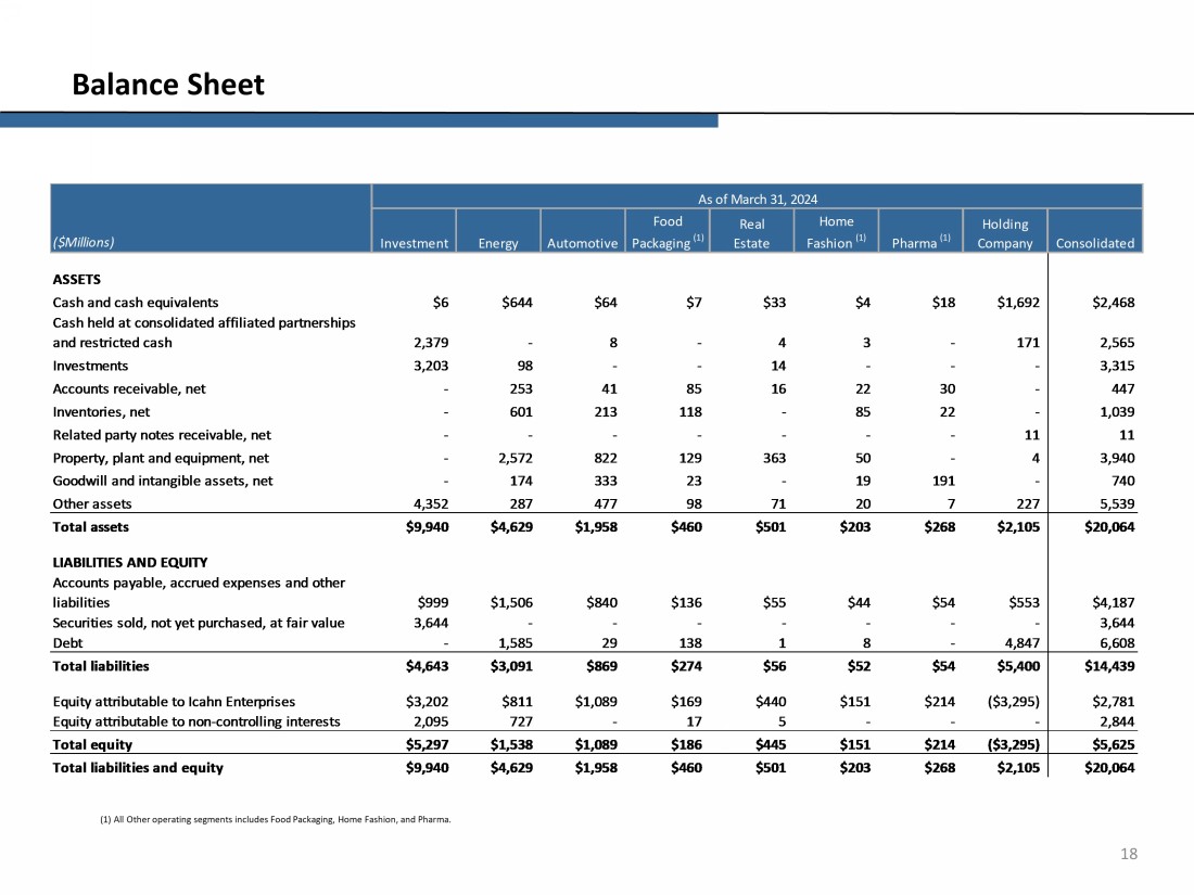 17合并财务快照(1)所有其他经营分部包括食品包装、家居时尚、制药。我们在表格10-Q的季度报告和我们向SEC提交的表格10-K的年度报告中发现了这些单独部分中每一个的结果。(2)请参阅附录中的调整后EBITDA对账。净收入(亏损):投资($ 32)($ 223)($ 1,353)($ 375)($ 40)($ 1,018)能源295968312478662汽车(260)(192)(6)(13)(9)(2)房地产(8)716-(2)14金属186------所有其他(1)(13)(38)4125控股公司(402)(175)(504)(218)(55)(341)净收入(亏损)($ 500)($ 25)($ 1,012)($ 358)($ 26)($ 680)减:归属于非控股权益的净收入(亏损)18158(328)(88)12(228)归属于伊坎企业的净收入(亏损)(518美元)($ 1,353)($ 375)($ 40)($ 1,018)能源4621,2531,4354012031,237汽车(67)(31)1132123115房地产(1)20283126金属38-----所有其他(1)625193232393控股公司(67)27(35)(7)(35)合并调整后EBITDA 395美元1,097美元281美元66美元203美元418减:归属于非控股权益的调整后EBITDA 221418(80)(29)6918归属于伊坎企业的调整后EBITDA 174美元679美元361美元95美元134美元400美元资本支出305美元338美元303美元58美元68美元313美元(百万美元)财年12月31日,截至3月31日止三个月LTM2021年3月31日20222023202320242024