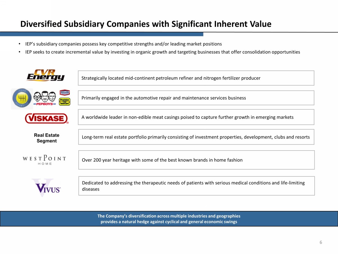6家多元化子公司,内在价值显著• IEP的子公司拥有关键竞争优势和/或领先的市场地位• IEP寻求通过投资于有机增长和瞄准业务来创造增量价值提供整合机会该公司在多个行业和地区的多元化为应对周期性和总体经济波动提供了自然对冲200多年来与一些家居时尚领域最知名品牌的传统非食用肉类肠衣的全球领导者有望在新兴市场获得进一步增长战略性地位的中部大陆石油精炼商和氮肥生产商长期房地产投资组合主要包括投资物业、开发、俱乐部和度假村房地产板块主要从事汽车维修和保养服务业务致力于解决患有严重医疗状况和限制生命疾病的患者的治疗需求