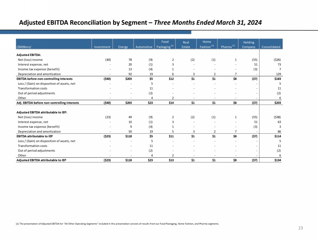 23按分部划分的调整后EBITDA调节–截至2024年3月31日的三个月(1)本演示文稿中包含的“所有其他经营分部”的调整后EBITDA列报包括我们的食品包装、家居时尚和制药分部的业绩。净(亏损)收入(40)78(9)2(2)(1)1(55)(26美元)利息支出,净额-20(1)3---5173所得税支出(收益)-13(4)1---(3)7折旧和摊销-92 196327-129(40美元)203美元5美元12美元1美元1美元8美元(7美元)183美元资产处置损失/(收益),净--5-----5转型成本--11-----11期外调整--(2)-----(2)其他---42-----6($ 40)$ 203 $ 23 $ 14 $ 1 $ 1 $ 8($ 7)$ 203净(亏损)收入(23)49(9)2(2)(1)1(55)($ 38)利息支出,净额-10(1)3---5163所得税费用(收益)-9(4)1----(3)3折旧和摊销-50195327-86($ 23)$ 118 $ 5 $ 11 $ 1 $ 1 $ 8($ 7)$ 114资产处置损失/(收益),净--5-----5转型成本--11-----11期外调整--(2)----(2)其他--42-----6($ 23)$ 118 $ 23 $ 13 $ 1 $ 1 $ 8($ 7)$ 134控股公司合并房地产家居时尚(1)Pharma(1)(百万美元)Investment Energy Automotive Food Packaging(1)Adjusted EBITDA attributable to IEP Adjusted EBITDA attributable to IEP:EBITDA attributable to IEP Adjusted EBITDA:EBITDA before non-controlling interests adj. EBITDA before non-controlling interests