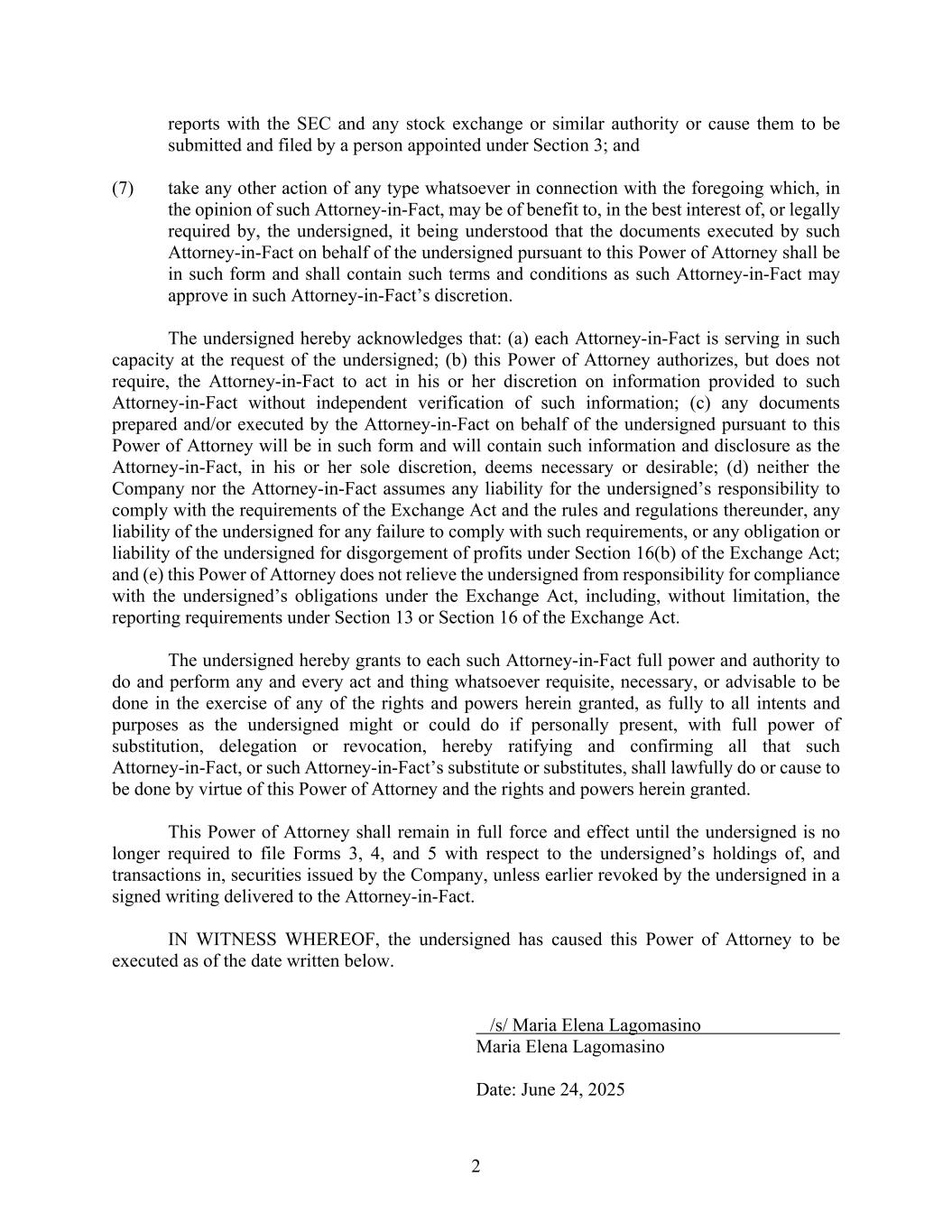 向SEC和任何证券交易所或类似机构提交2份报告,或促使其由根据第3条指定的人提交和归档;(7)就上述事项采取任何其他任何类型的行动,而该律师认为,这些行动可能有利于、符合以下签署人的最佳利益或法律要求,据了解,该实际代理人根据本授权书代表以下签署人签署的文件应采用该实际代理人酌情批准的格式,并应包含该实际代理人可能批准的条款和条件。以下签署人在此确认:(a)每一位实际代理人是应以下签署人的请求以该身份任职的;(b)本授权书授权但不要求实际代理人对提供给该实际代理人的信息行使其酌处权,而无需对该信息进行独立核实;(c)实际代理人根据本授权书代表以下签署人准备和/或签署的任何文件将采用该形式,并将包含实际代理人全权酌情决定的信息和披露,认为必要或可取;(d)公司或实际代理人均不对以下签署人遵守《交易法》及其规则和条例的责任承担任何责任,以下签署人因未能遵守此类要求而承担的任何责任,或以下签署人根据《交易法》第16(b)节对利润的追缴承担的任何义务或责任;(e)本授权书并不免除以下签署人遵守《交易法》规定的义务的责任,包括但不限于,《交易法》第13条或第16条规定的报告要求。下列签署人特此授予每一名该等实际代理人全权和授权,在行使本协议所授予的任何权利和权力时,完全按照以下签署人在亲自出席时可能或可能做的所有意图和目的,执行和执行任何必要、必要或可取的行为和事情,并具有完全的替代、转授或撤销权力,特此批准和确认该等实际代理人或该等实际代理人的替代人或替代人的所有行为和事情,应凭借本授权书及本授权书所授予的权利和权力合法地作出或促使作出。本授权书应一直有效,直至以下签署人不再被要求就以下签署人持有和交易公司发行的证券提交表格3、4和5,除非以下签署人以交付给实际代理人的签字书面提前撤销。下列签署人已促使本授权书自下述日期起获签立,以作为证明。/s/Maria Elena Lagomasino丨Maria Elena Lagomasino Maria Elena Lagomasino日期:2025年6月24日