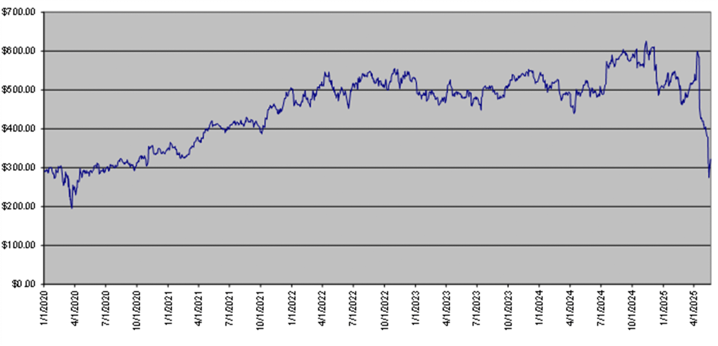 标的2025年5月20日收盘水平为321.58美元。下图列出了下文所述期间基础证券的每日收盘水平。我们从彭博金融市场获得了这份文件中提供的历史信息,未经独立核实。底层证券有时经历过高波动性时期。不应将标的的历史收盘水平作为其未来表现的指示,任何时候都不能对标的的收盘水平给出任何保证。