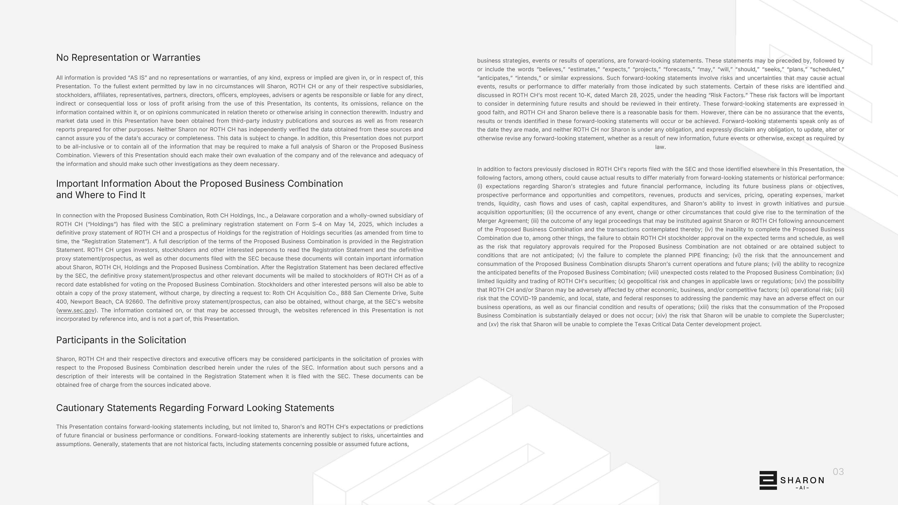 经营战略、事件或经营成果,均为前瞻性陈述。这些陈述可能在前面、后面加上或包括“相信”、“估计”、“预期”、“项目”、“预测”、“可能”、“将”、“应该”、“寻求”、“计划”、“计划”、“预期”、“打算”或类似的表达方式。此类前瞻性陈述涉及风险和不确定性,可能导致实际事件、结果或业绩与此类陈述所表明的存在重大差异。其中某些风险在ROTH CH于2025年3月28日发布的最新10-K中被识别和讨论,标题为“风险因素”。”这些风险因素将是确定未来结果时需要考虑的重要因素,应该对其进行全面审查。这些前瞻性陈述是善意表达的,ROTH CH和Sharon认为这些陈述有合理的依据。然而,无法保证这些前瞻性陈述中确定的事件、结果或趋势将会发生或实现。前瞻性陈述仅在作出之日起生效,ROTH CH和Sharon均不承担任何义务,并明确表示不承担任何义务,更新、更改或以其他方式修改任何前瞻性陈述,无论是由于新信息、未来事件或其他原因,除非法律要求。除了此前在ROTH CH向SEC提交的报告中披露的因素以及本演示文稿其他部分确定的因素外,以下因素可能导致实际结果与前瞻性陈述或历史业绩存在重大差异:(i)对Sharon战略和未来财务业绩的预期,包括其未来业务计划或目标、预期业绩和机会以及竞争对手、收入、产品和服务、定价、运营费用、市场趋势、流动性、现金流和现金用途、资本支出,和Sharon投资于增长计划和寻求收购机会的能力;(ii)可能导致终止合并协议的任何事件、变化或其他情况的发生;(iii)在宣布拟议业务合并及其所设想的交易后可能对Sharon或ROTH CH提起的任何法律诉讼的结果;(iv)由于(其中包括)未能按预期条款和时间表获得ROTH CH股东的批准而无法完成拟议业务合并,以及未获得拟议业务合并所需的监管批准或在未预期的条件下获得的风险;(v)未能完成计划的PIPE融资;(vi)风险建议业务合并的宣布和完成扰乱了Sharon目前的运营和未来计划;(vii)确认建议业务合并的预期收益的能力;(viii)与建议业务合并相关的意外成本;(ix)ROTH CH证券的流动性和交易受限;(x)地缘政治风险和适用法律或法规的变化;(xiv)ROTH CH和/或Sharon可能受到其他经济、业务和/或竞争因素的不利影响;(xi)运营风险;(xii)风险COVID-19大流行,以及地方、州、和联邦应对大流行可能对我们的业务运营以及我们的财务状况和经营业绩产生不利影响;(十三)拟议业务合并的完成被大幅推迟或没有发生的风险;(十四)Sharon无法完成超级集群的风险;(十五)Sharon无法完成德州关键数据中心开发项目的风险。有关拟议业务合并的重要信息以及与拟议业务合并相关的在哪里可以找到的信息,Roth CH Holdings,Inc.是一家特拉华州公司,是ROTH CH(“控股”)的全资子公司,已于2025年5月14日向SEC提交了S-4表格的初步注册声明,其中包括ROTH CH的最终代理声明和Holdings的招股说明书,用于注册控股证券(经不时修订,“注册声明”)。注册声明中提供了有关拟议业务合并条款的完整描述。ROTH CH敦促投资者、股东和其他相关人士阅读注册声明和最终代理声明/招股说明书,以及向SEC提交的其他文件,因为这些文件将包含有关Sharon、ROTH CH、Holdings和拟议业务合并的重要信息。在注册声明被SEC宣布生效后, 最终代理声明/招股说明书和其他相关文件将于就拟议业务合并进行投票所确定的记录日期邮寄给ROTH CH的股东。股东和其他感兴趣的人也可以免费获得一份代理声明,只需将请求发送至:Roth CH Acquisition Co.,888 San Clemente Drive,Suite 400,Newport Beach,加利福尼亚州 92660。最终的代理声明/招股说明书,也可以在SEC网站(www.sec.gov)免费获得。本演示文稿中引用的网站上包含的或可通过其访问的信息未通过引用并入本演示文稿,也不是其一部分。根据SEC的规则,Sharon、ROTH CH及其各自的董事和执行官可能被视为与此处描述的拟议业务合并有关的代理征集的参与者。有关这些人的信息及其利益描述将包含在向SEC提交的注册声明中。这些文件可从上述来源免费获得。关于前瞻性陈述的警示性陈述本演示文稿包含前瞻性陈述,包括但不限于Sharon和ROTH CH对未来财务或业务表现或状况的预期或预测。前瞻性陈述本质上受制于风险、不确定性和假设。通常,非历史事实的陈述,包括关于可能或假定的未来行动的陈述,03所有信息均按“原样”提供,并且在本演示文稿中或就本演示文稿而言,不提供任何类型的明示或暗示的陈述或保证。在任何情况下,在法律允许的最大范围内,Sharon、ROTH CH或其各自的任何子公司、股东、关联公司、代表、合伙人、董事、高级职员、雇员、顾问或代理人将对因使用本演示文稿、其内容、其遗漏、依赖其中包含的信息、或根据与此相关的沟通意见或与此相关的其他方式而产生的任何直接、间接或后果性损失或利润损失负责或承担责任。本演示文稿中使用的行业和市场数据来自第三方行业出版物和来源以及为其他目的编制的研究报告。Sharon和ROTH CH均未独立验证从这些来源获得的数据,无法向您保证数据的准确性或完整性。这一数据可能会发生变化。此外,本演示文稿并不旨在包含所有内容或包含对Sharon或拟议业务合并进行全面分析可能需要的所有信息。本次演示的观众应各自对公司以及信息的相关性和充分性做出自己的评估,并应进行他们认为必要的其他调查。没有代表或保证
