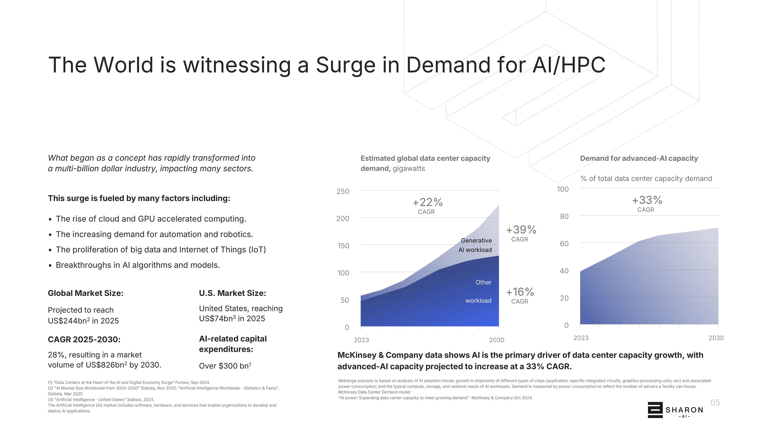 世界正在见证对AI/HPC的需求激增,最初的概念已迅速转变为一个价值数十亿美元的产业,影响了许多行业。推动这一增长的因素有很多,其中包括:•云和GPU的兴起加速了计算。•对自动化和机器人技术的需求不断增加。•大数据和物联网(IoT)扩散• AI算法和模型取得突破。25020015010050020232030年生成Al工作量+ 22% CAGR + 39% CAGR + 16% CAGR全球数据中心容量需求估算,千兆瓦10080604020020232030 + 33% CAGR对先进-AI容量需求占数据中心总容量需求的百分比全球市场规模:预计2025年将达到2440亿美元2 CAGR 2025-2030:28%,到2030年市场规模将达到8260亿美元2。美国市场规模:美国,2025年达到740亿美元3人工智能相关资本支出:超过3000亿美元1中端场景基于对Al采用趋势的分析;不同类型芯片(应用-特定fic集成电路、图形处理单元等)出货量的增长和相关功耗;以及Al工作负载的典型计算、存储和网络需求。需求是通过功耗来衡量的,以反映一个设施可以容纳的服务器数量。麦肯锡数据中心需求模型“AI力量:扩大数据中心容量以满足不断增长的需求”麦肯锡公司2024年10月。05麦肯锡公司数据显示,人工智能是数据中心容量增长的主要驱动力,预计先进的AI容量将以33%的复合年增长率增长。(1)“AI和数字经济的核心数据中心激增”福布斯,2024年9月(2)“2020-2030年全球AI市场规模”Statista,2025年11月;“全球人工智能-统计与事实”,Statista,2025年3月(3)“人工智能-美国”Statista,2024年。人工智能(AI)市场包括软件、硬件和服务,使组织能够开发和部署AI应用程序。