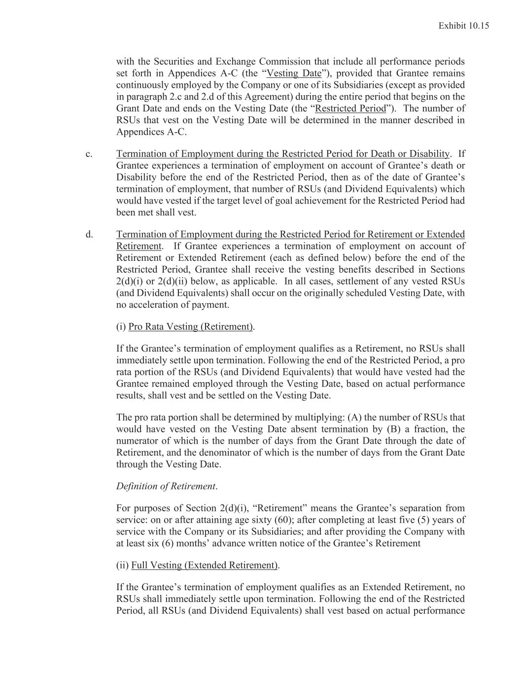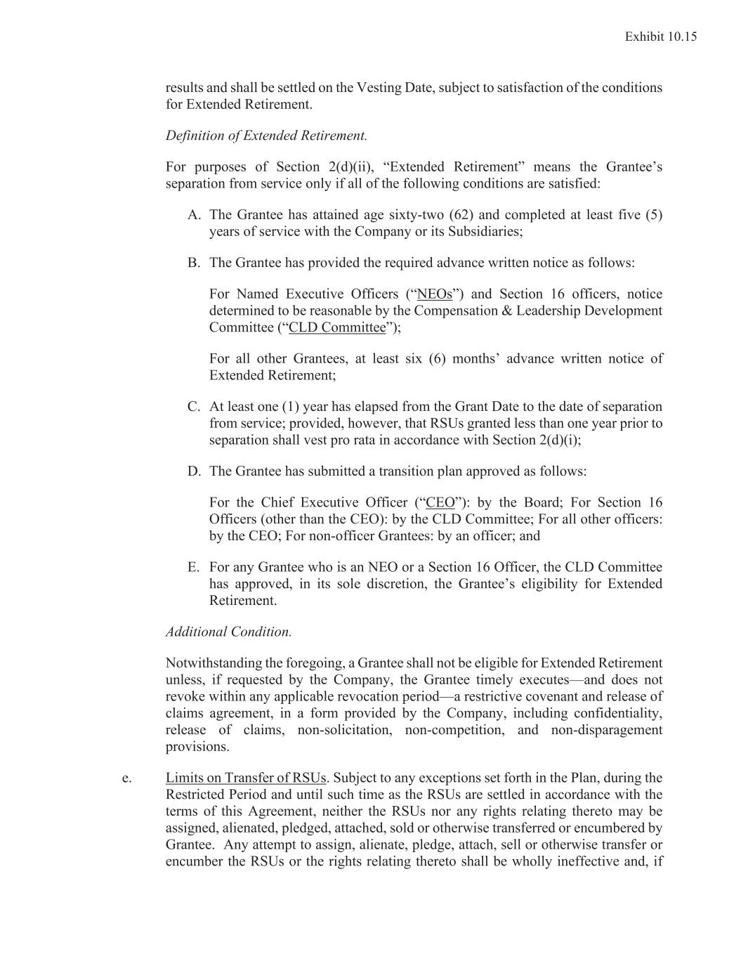 受限–保密结果,应在归属日结算,但须满足延长退休的条件。延长退休的定义。就第2(d)(ii)条而言,“延长退休”是指只有在满足以下所有条件的情况下,承授人才会离职:A.承授人已年满六十二(62)岁,并在公司或其附属公司完成至少五(5)年的服务;B.承授人已提供所需的提前书面通知如下:对于指定的执行官(“NEO”)和第16节官员,由薪酬与领导力发展委员会(“CLD委员会”)确定为合理的通知;对于所有其他受授人,提前至少六(6)个月发出延长退休的书面通知;C.自批予日起至离职日期至少已过去一(1)年;但条件是,离职前不到一年授予的RSU应根据第2(d)(i)节按比例归属;D.承授人已提交如下批准的过渡计划:对于首席执行官(“CEO”):由董事会;对于第16条官员(CEO除外):由CLD委员会;对于所有其他官员:E.对于作为NEO或第16条官员的任何承授人,CLD委员会已全权酌情批准承授人的延长退休资格。附加条件。尽管有上述规定,承授人不得有资格获得延长退休,除非在公司提出要求时,承授人以公司提供的形式及时执行——且不在任何适用的撤销期内撤销——限制性契约和解除债权协议,包括保密条款。e.对RSU转让的限制。除计划中规定的任何例外情况外,在限制期内,直至受限制股份单位根据本协议条款结算为止,受让人不得转让、转让、质押、附加、出售或以其他方式转让或设押受让人的受限制股份单位或与其有关的任何权利。任何试图转让、转让、质押、附加、出售或以其他方式转让或设押受限制股份单位或与之相关的权利的企图均为完全无效的,并且,如果附件 10.15