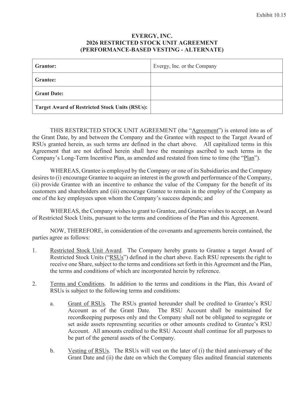 EVERGY,INC.2026限制性股票单位协议(基于业绩的归属-替代)授予人:Evergy,Inc.或公司受让人:授予日期:限制性股票单位(RSU)的目标授予:本限制性股票单位协议(“协议”)由公司与受让人于授予日就此处授予的限制性股票单位的目标授予订立,该等条款定义见上表。本协议中所有未在此定义的大写术语应具有公司长期激励计划(经不时修订和重述)(“计划”)中这些术语所赋予的含义。然而,承授人受雇于公司或其一间附属公司,而公司希望(i)鼓励承授人收购有关公司增长及业绩的权益,(ii)为客户及股东的利益向承授人提供提升公司价值的激励,及(iii)鼓励承授人继续受雇于公司,作为公司成功所依赖的关键雇员之一;而鉴于公司希望向承授人授予且承授人希望接受限制性股票单位的奖励,根据该计划和本协议的条款和条件。因此,考虑到本协议所载的契诺和协议,各方同意如下:1。限制性股票奖励。公司特此向承授人授予上表中定义的限制性股票单位(“RSU”)的目标奖励。每个RSU代表获得一股股份的权利,但须遵守本协议和计划中规定的条款和条件,其条款和条件通过引用并入本文。2.条款和条件。除计划中的条款和条件外,本次授予RSU还受以下条款和条件的约束:a.授予RSU。根据本协议授予的受限制股份单位应于授予日记入承授人的受限制股份单位账户。受限制股份单位账户的维持仅用于记录目的,公司没有义务分离或置出代表证券的资产或记入承授人受限制股份单位账户的其他金额。记入受限制股份单位账户的所有金额在所有用途中应继续作为公司一般资产的一部分。b.受限制股份单位的归属。受限制股份单位将于(i)授予日的第三个周年日及(ii)公司提交经审核财务报表之日(10.15)中较晚者归属