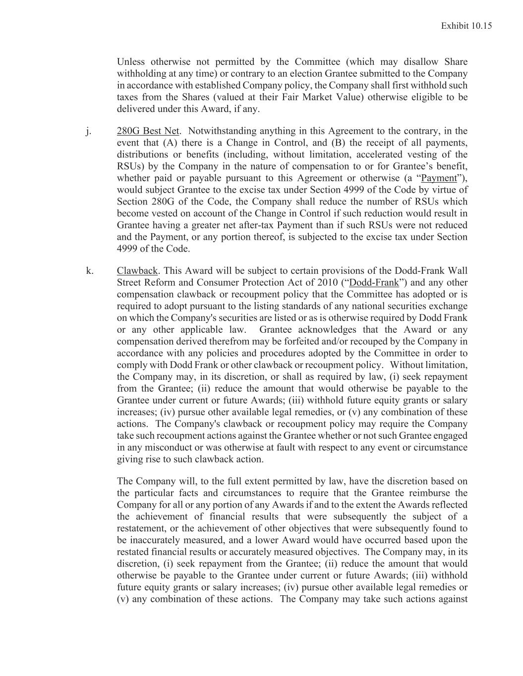 限制性–保密除非委员会另有许可(委员会可随时禁止预扣股份)或与根据既定公司政策向公司提交的选举承授人相反,否则公司应首先从根据本裁决有资格交付的股份(按其公平市场价值估值)中预扣此类税款,如果有的话。j. 280G Best Net。尽管本协议中有任何相反的规定,如果(a)控制权发生变更,以及(b)公司收到对承授人利益的补偿性质的所有付款、分配或利益(包括但不限于加速归属受限制股份单位),无论是根据本协议或其他方式支付或应付(“付款”),则承授人将根据《守则》第280G条根据《守则》第4999条缴纳消费税,公司应减少因控制权变更而归属的受限制股份单位的数量,如果此类减少将导致承授人的税后净支付额高于未减少此类受限制股份单位且支付的款项或其任何部分需根据《守则》第4999节缴纳消费税的情况。k.追回。本裁决将受制于2010年《多德-弗兰克华尔街改革和消费者保护法》(“多德-弗兰克”)的某些条款以及委员会根据公司证券上市的任何国家证券交易所的上市标准或多德弗兰克或任何其他适用法律的其他要求已采用或被要求采用的任何其他补偿回拨或补偿政策。承授人承认,公司可根据委员会为遵守Dodd Frank或其他追回或补偿政策而采取的任何政策和程序,没收和/或补偿该裁决或由此产生的任何补偿。在不受限制的情况下,公司可酌情或应按法律规定,(i)向承授人寻求偿还;(ii)减少根据当前或未来的奖励本应支付给承授人的金额;(iii)扣留未来的股权授予或加薪;(iv)寻求其他可用的法律补救措施,或(v)这些行动的任何组合。公司的追回或补偿政策可能要求公司对承授人采取此类补偿行动,无论该承授人是否从事任何不当行为或在导致此类追回行动的任何事件或情况方面存在其他过错。公司将在法律允许的充分范围内,根据特定事实和情况,酌情要求承授人向公司偿还任何奖励的全部或任何部分,前提是奖励反映了后来被重述的财务业绩的实现情况,或后来被发现计量不准确的其他目标的实现情况,并且根据重述的财务业绩或准确计量的目标会发生较低的奖励。公司可酌情(i)向承授人寻求偿还;(ii)减少根据当前或未来奖励本应支付给承授人的金额;(iii)扣留未来的股权授予或加薪;(iv)寻求其他可用的法律补救措施或(v)这些行动的任何组合。公司可能会针对附件 10.15采取此类行动