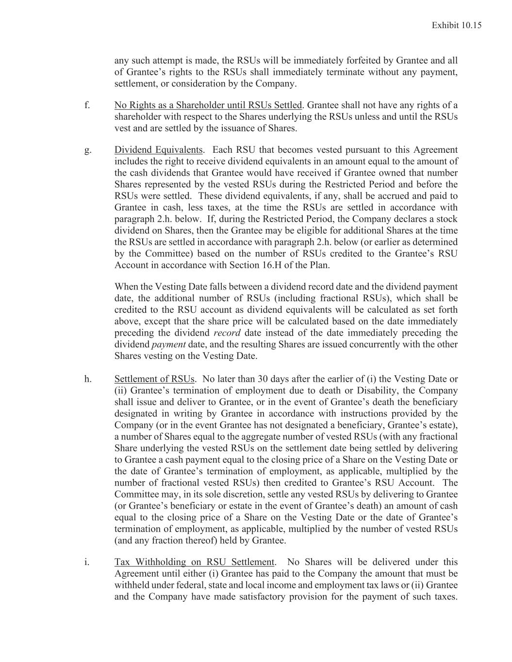 受限–保密任何此类尝试,受让人将立即没收受限制股份单位,且受让人对受限制股份单位的所有权利应立即终止,而无需公司支付、结算或对价。f.在受限制股份单位结算之前,没有作为股东的权利。承授人不得就受限制股份单位的基础股份享有股东的任何权利,除非及直至受限制股份单位归属并通过发行股份结算。g.股息等价物。根据本协议归属的每个受限制股份单位包括有权获得相当于如果承授人在限制期内和在受限制股份单位结算之前拥有由已归属的受限制股份单位所代表的该数量的股份,则承授人本应获得的现金股息金额的等值股息。这些股息等价物(如有)应在根据下文第2.h.段结算受限制股份单位时以现金减去税款的方式应计并支付给承授人。如果在限制期内,公司宣布就股份派发股票股息,则承授人可能有资格在根据下文第2.h.段结算受限制股份单位时(或根据委员会根据计划第16.H节确定的更早)根据受授人受限制股份单位账户贷记的受限制股份单位数量获得额外股份。当归属日期介于股息记录日期和股息支付日期之间时,应作为股息等价物记入受限制股份单位账户的额外数量的受限制股份单位(包括零碎受限制股份单位)将按上述方式计算,但股份价格将根据紧接股息记录日期之前的日期而不是紧接股息支付日期之前的日期计算,由此产生的股份与归属日期归属的其他股份同时发行。h.受限制股份单位的结算。不迟于(i)归属日期或(ii)承授人因死亡或伤残而终止雇用的较早日期后30天内,公司须向承授人发行及交付承授人,或在承授人死亡的情况下,由承授人按照公司提供的指示以书面指定的受益人(或在承授人未指定受益人的情况下,承授人的遗产),相当于已归属受限制股份单位总数的股份数目(在结算日作为已归属受限制股份单位基础的任何零碎股份通过向承授人交付相当于在归属日或承授人终止雇佣日期(如适用)的股份收盘价的现金付款乘以零碎已归属受限制股份单位的数量来结算),然后记入承授人的受限制股份单位账户。委员会可全权酌情通过向承授人(或承授人的受益人或在承授人死亡的情况下的遗产)交付相当于在归属日期或承授人终止雇佣日期(如适用)的股份收盘价乘以承授人持有的已归属受限制股份单位(及其任何零头)的现金数额来结算任何已归属的受限制股份单位。i.对受限制股份单位结算的扣税。在(i)承授人已向公司支付根据联邦、州和地方收入和就业税法必须预扣的金额或(ii)承授人和公司已就支付此类税款作出令人满意的规定之前,不会根据本协议交付任何股份。附件 10.15