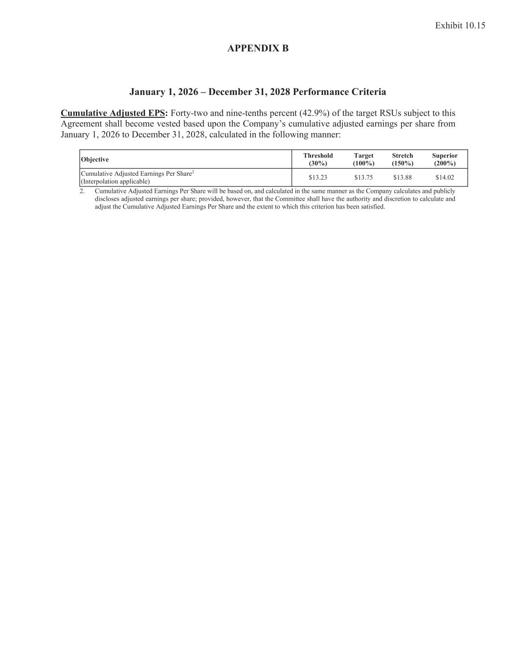受限–机密附录B2026年1月1日– 2028年12月31日业绩标准累计调整后EPS:本协议标的RSU的百分之四十二和百分之九(42.9%)将根据公司2026年1月1日至2028年12月31日的累计调整后每股收益归属,计算方式如下:客观门槛(30%)目标(100%)拉伸(150%)优越(200%)累计调整后每股收益2(适用插值)$ 13.23 $ 13.75 $ 13.88 $ 14.02 2。累计调整后每股收益将以公司计算和公开披露调整后每股收益为基础,并以相同方式计算;但前提是委员会应拥有计算和调整累计调整后每股收益的权力和酌处权,以及满足这一标准的程度。附件 10.15
