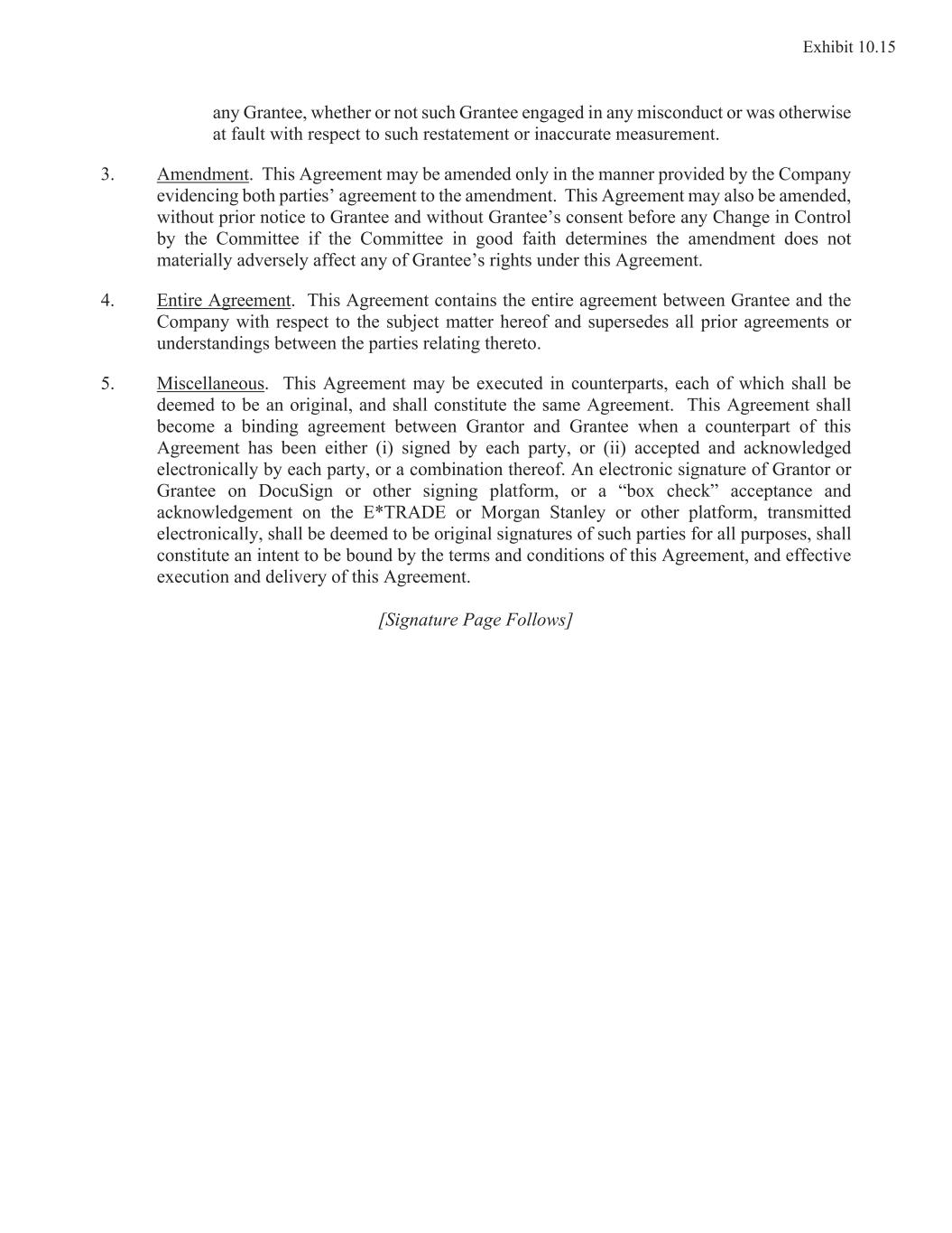 受限–对任何承授人进行保密,无论该承授人是否就此类重述或不准确的计量从事任何不当行为或存在其他过错。3.修正。本协议只能按照公司提供的证明双方同意修改的方式进行修改。如果委员会本着诚意确定该修订不会对承授人在本协议下的任何权利产生重大不利影响,则本协议也可在委员会变更控制权之前进行修订,而无需事先通知承授人,也无需承授人同意。4.全部协议。本协议包含承授人与本公司就本协议标的事项达成的全部协议,并取代各方之前就此达成的所有协议或谅解。5.杂项。本协议可以对应方执行,每一方视为正本,构成同一协议。当本协议的对应方已(i)由每一方签署,或(ii)由每一方以电子方式接受和承认,或两者结合时,本协议应成为设保人和受让人之间具有约束力的协议。设保人或受让人在DocuSign或其他签约平台上的电子签名,或在E上的“框勾选”验收确认*TRADE或摩根士丹利或其他平台,以电子方式传输的,在所有目的下均应视为此类方的原始签名,应构成受本协议条款和条件约束的意图,并有效执行和交付本协议。[签名页关注] 附件 10.15