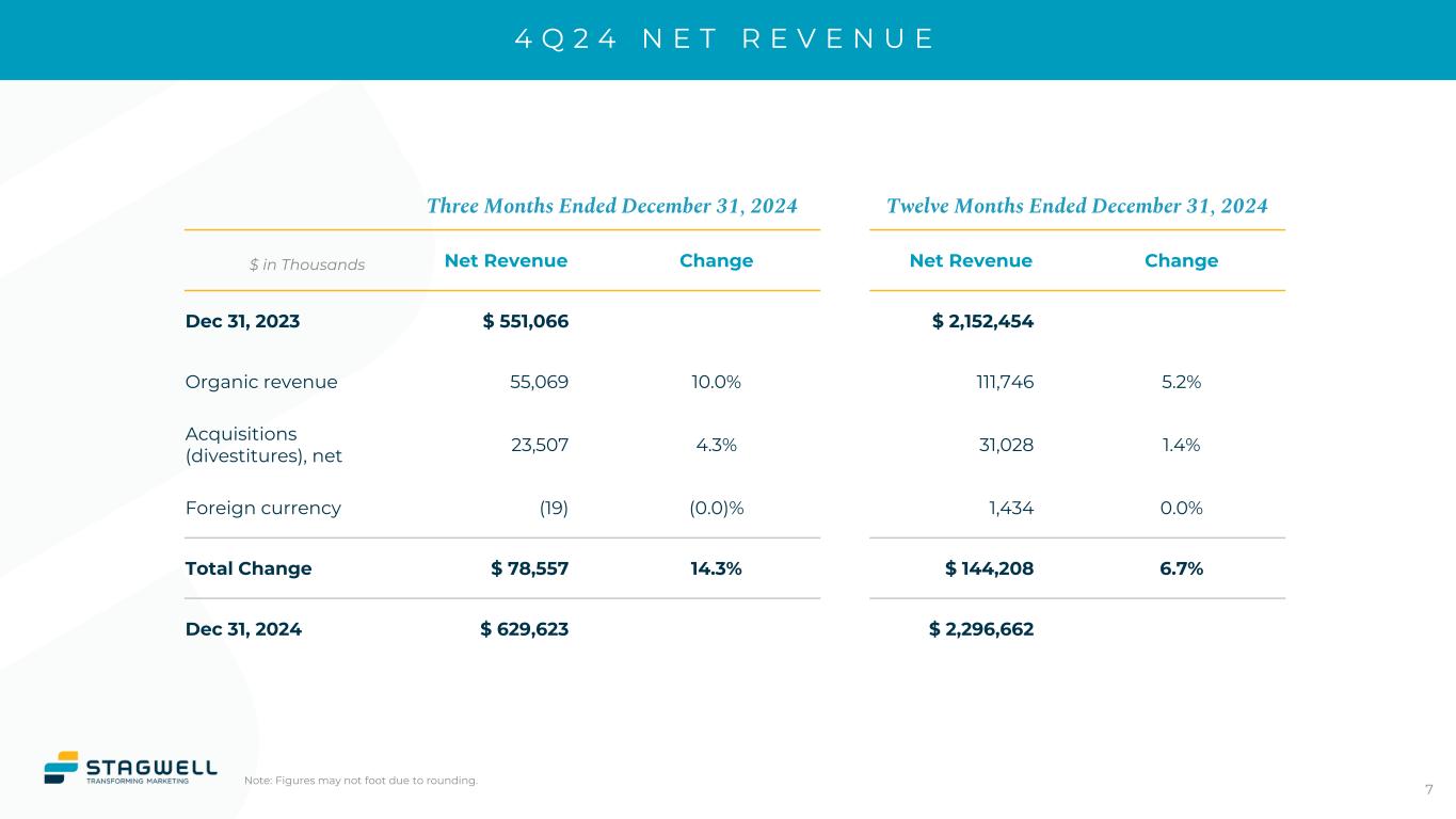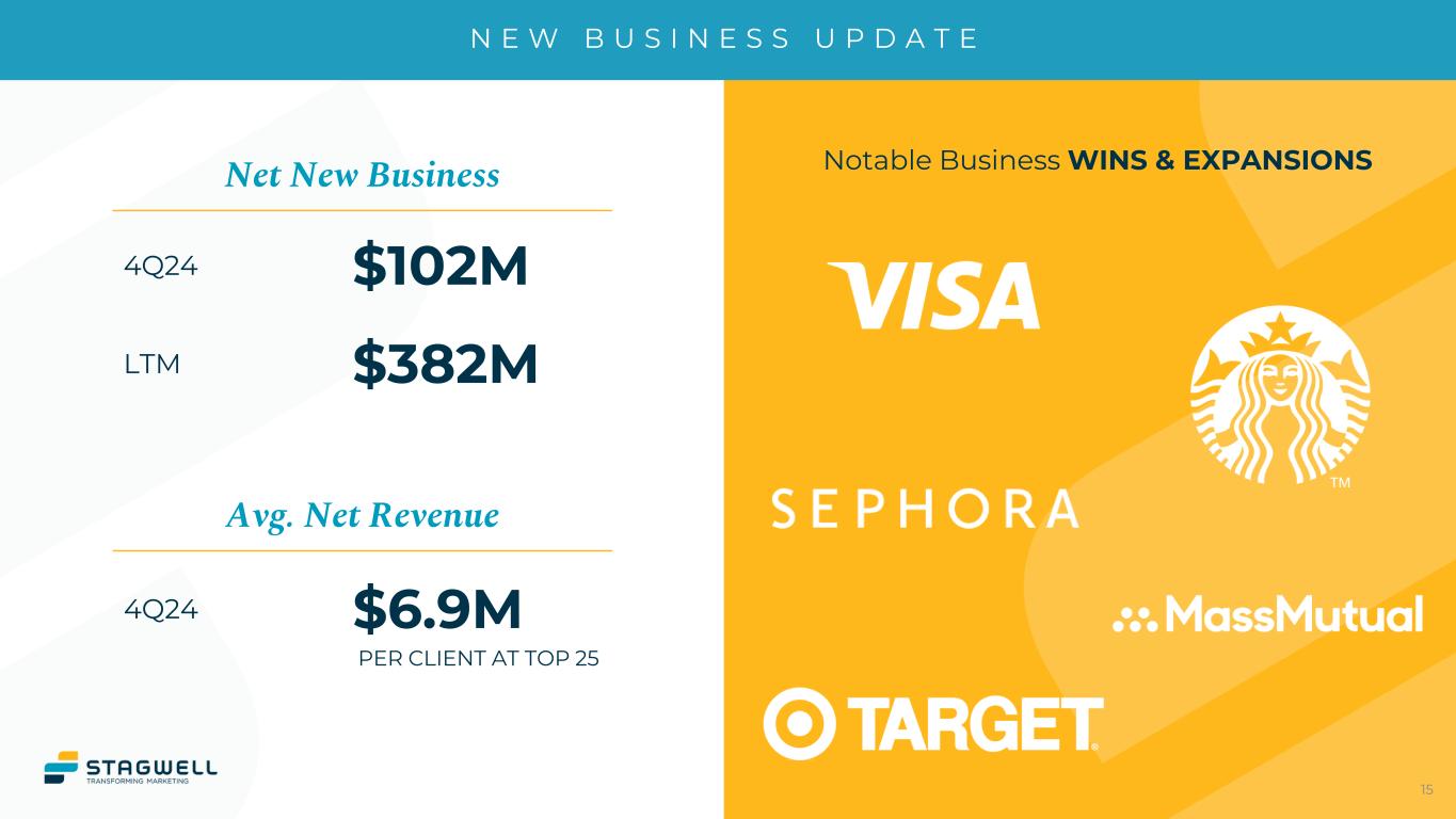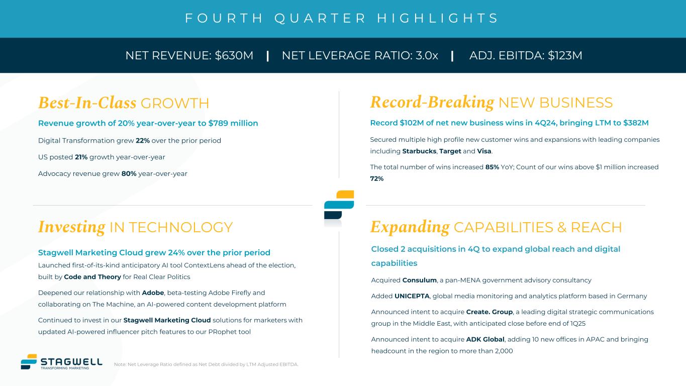 F O U R T H Q U A R T E R H I G H L I G H T S净收入:6.3亿美元|净杠杆比率:3.0倍| ADJ。EBITDA:1.23亿美元扩大能力并达到同类最佳增长投资于技术破纪录的新业务第四季度完成了2项收购,以扩大全球影响力和数字能力收购Consulum,一家泛中东和北非地区政府咨询咨询公司增加了UNICEPTA,总部位于德国的全球媒体监测和分析平台宣布有意收购Create。中东领先的数字战略传播集团Group预计将于25年第一季度结束前完成收购,宣布有意收购ADK Global,在亚太地区增加10个新办事处,并使该地区的员工人数达到2000多人,在24年第四季度净新业务赢得了创纪录的1.02亿美元,使LTM达到3.82亿美元,获得了多个备受瞩目的新客户赢得和与包括星巴克、Target和Visa在内的领先公司的扩张。胜选总数同比增长85%;超过100万美元的胜选次数增长72%收入同比增长20%至7.89亿美元数字化转型比上一期增长22%美国公布21%的同比增长宣传收入同比增长80% Stagwell营销云在上一期增长24%在大选前推出了首创的预见性AI工具ContextLens,由Code and Theory为Real Clear Politics构建,加深了我们与Adobe的关系,对Adobe Firefly进行了Beta测试并在机器上进行了合作,一个人工智能驱动的内容开发平台,继续投资于我们为营销人员提供的Stagwell营销云解决方案,该解决方案具有更新的人工智能驱动的网红推介功能,可用于我们的PROFet工具注:净杠杆率定义为净债务除以LTM调整后EBITDA。