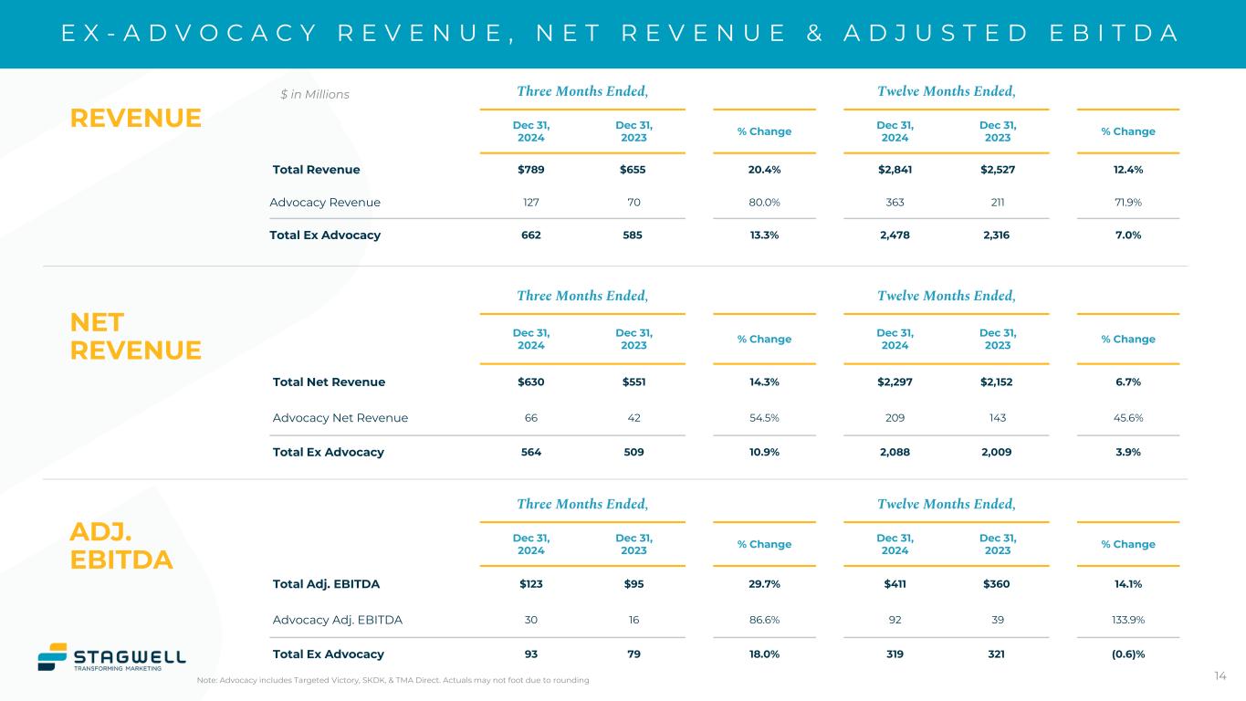 截至三个月、截至十二个月、2024年12月31日、2023年12月31日、2023年12月31日、2023年12月31日、2023年12月31日、2023年12月31日、2023年12月31日、2023年12月31日、2023年12月31日、2023年12月31日、2023年12月31日、2023年12月31日、2023年12月31日、2023年12月31日、2023年12月31日、2023年12月31日、2023年12月31日、2023年12月31日、2023年12月31日、2023年12月31日、2023年12月31日、2023年12月31日、2023年12月31日、2023年12月31日、2023年12月31日、2023年12月31日、2023年12月31日、2023年12月31日、2023年12月31日、2023年12月31日、2023年12月31日、2023年12月31日、2023年12月31日、2023年12月31日、2023年12月31日、2023年12月31日、2023年12月31日、2023年12月31日、2023年12月31日、2023年12月31日、2023年12月31日、2023年12月31日、2023年12月31日、2023年12月31日、2023年12月31日、2023年12月31日、2023年12月截至2024年12月31日的12个月2023年12月31日%变化2024年12月31日2023年12月31日%变化总调整后EBITDA $ 123 $ 9529.7% $ 411 $ 36014.1% Advocacy Adj. EBITDA 301686.6% 9239133.9% Total ex Advocacy 937918.0% 319321(0.6)% E X-A D V O C A C Y R E V E N U E,N E T R E V E N U E & A D J US T E D E B I T D A注:Advocacy includes Targeted Victory,SKDK,& TMA Direct。由于以百万美元计的净收入ADJ四舍五入,实际值可能不会出现。EBITDA 14收入