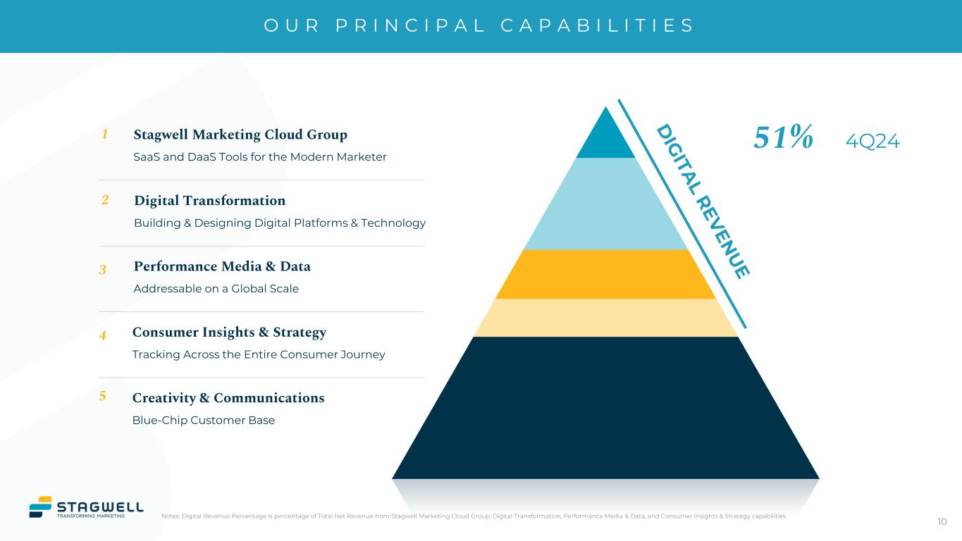 O U R P R I N C I P A L C A P A B I L I T I E S Creativity & Communications蓝筹客户群绩效媒体和数据可在全球范围内寻址整个消费者旅程的消费者洞察和战略跟踪数字化转型构建和设计数字平台和技术23451051% 4Q24Stagwell Marketing Cloud Group SaaS和DaaS Tools for the Modern Marketer 1注:数字收入百分比是来自Stagwell营销云集团、数字化转型、绩效媒体和数据的总净收入的百分比,和消费者洞察与战略能力