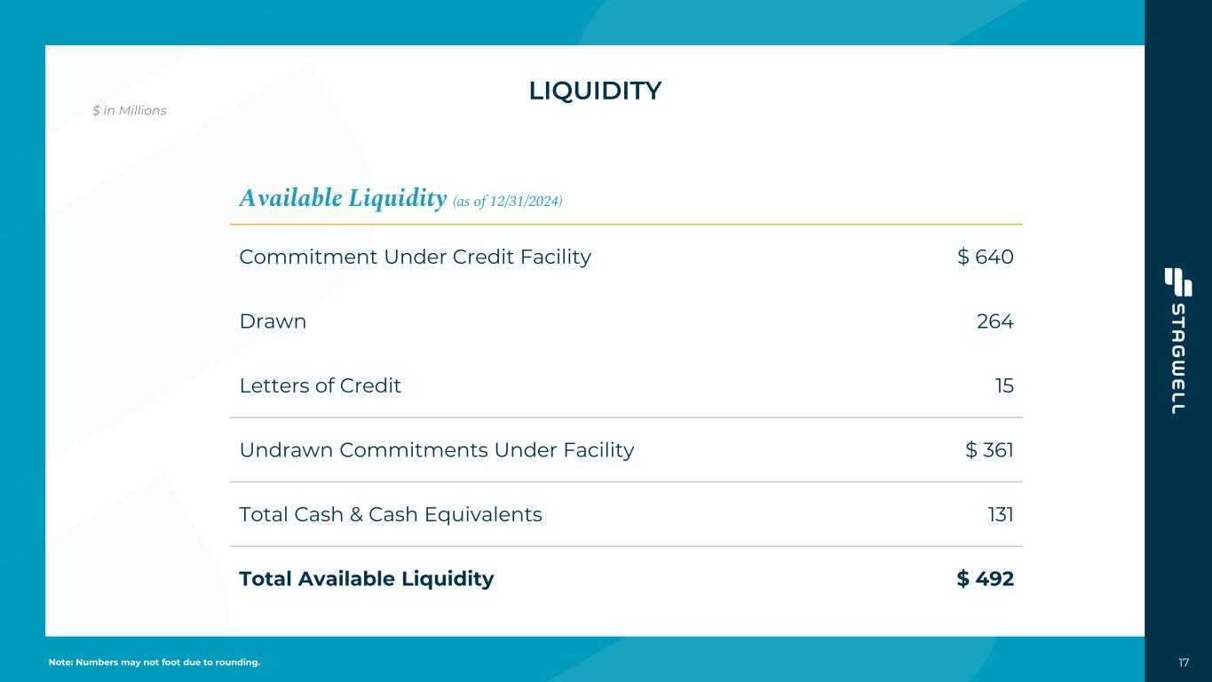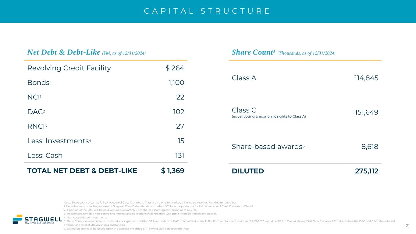 C A P I T A L S T R U C T U R E注:股份计数假设C类股份按一对一基准全部转换为A类。由于四舍五入,数字可能不符合1。不包括Stagwell C类股东的非控制性权益,以反映将C类股份完全转换为A类的NCI余额备考。2。假设截至12/31/24进行转换,将以约580万股股份支付部分发援会。3.包括与雇员持有的利润权益相关的可赎回非控股权益和义务。4.非合并投资5。股票数量不包括未归属的股票授予、未结算的SAR或将以股票结算的部分DAC。截至2025年2月22日,备考总股数为1.149亿股A类股、151.6股C类股、620万股将结算DAC和860万股基于股份的奖励,总计2.814亿股流通股。6.采用库藏法行使已结算的SAR奖励时预计发行的股份。净债务和类债务(百万美元,截至2024年12月31日)循环信贷融资264美元债券1,100 NCI1 22 DAC2 102 RNCI3 27减:投资415减:现金131总净债务和类债务1,369美元股票计数5(千,截至2024年12月31日)A类114,845 C类(平等投票权和A类经济权利)151,649股份奖励6 8,618稀释275,11221