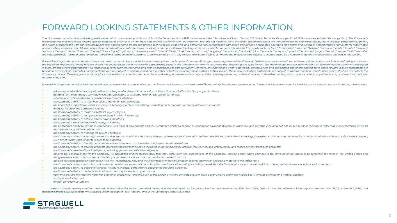 本文件包含前瞻性陈述。在经修订的1933年《证券法》第27A条(“证券法”)和经修订的1934年《证券交易法》第21E条(“交易法”)的含义内。公司代表也可能不时以口头或书面形式作出前瞻性陈述。本文件中非历史事实的陈述,包括关于公司的信念和预期、未来财务业绩、增长和未来前景、公司战略、业务和经济趋势和增长、技术领先和差异化、潜在和已完成的收购、预期运营效率和协同效应以及可赎回非控制性权益和递延收购对价的金额估计的陈述,构成前瞻性陈述。前瞻性陈述,通常用“目标”、“预期”、“假设”、“相信”、“继续”、“可能”、“创造”、“发展”、“估计”、“预期”、“重点”、“预测”、“预见”、“未来”、“目标”、“指导”、“发展中”、“打算”、“可能”、“看”、“维持”、“可能”、“进行中”、“机会”、“展望”、“计划”、“可能”、“潜在”、“预测”、“可能”、“项目”、“应该”、“目标”、“将”、“将”或此类术语的否定或其其他变体以及与当前计划、估计和预测的任何讨论相关的类似物质的术语可能会根据多种因素发生变化,包括本文件中的前瞻性陈述基于公司做出的某些关键预期和假设。尽管公司管理层认为此类前瞻性陈述所依据的预期和假设是合理的,但不应过分依赖前瞻性陈述,因为公司无法保证这些陈述将被证明是正确的。此类前瞻性陈述所依据的重大假设除其他外,包括与一般商业、经济和市场条件、竞争环境、预期和未预期的税务后果以及预期和未预期的成本有关的假设。这些前瞻性陈述基于当前的计划、估计和预测,可能会根据包括本节概述的因素在内的许多因素而发生变化。这些前瞻性陈述受到各种风险和不确定性的影响,其中许多风险和不确定性超出了公司的控制范围。因此,您不应过分依赖此类声明。前瞻性陈述仅在作出之日起生效,公司不承担根据新信息或未来事件(如有)公开更新其中任何内容的义务。前瞻性陈述涉及固有风险和不确定性。许多重要因素可能导致实际结果与任何前瞻性陈述中包含的结果存在重大差异。此类风险因素包括但不限于以下方面:•与国际、国家和区域不利经济状况相关的风险,可能影响公司或其客户;•对公司服务的需求,这可能会加速或加剧其他风险和不确定性;•通货膨胀和中央银行为应对通货膨胀而采取的行动;•公司吸引新客户和留住现有客户的能力;•客户支出减少和客户广告变化的影响,营销和企业传播要求;•公司客户的财务失败;•公司留住和吸引关键员工的能力;•公司在其经营所在市场的竞争能力;•公司实现其成本节约举措的能力;•公司实施战略举措的情况;•公司继续遵守其债务协议的能力以及公司在到期应付时为其或有付款义务提供资金的能力,包括但不限于与可赎回非控制性权益和递延收购对价有关的那些;•公司有效管理其增长的能力;•公司识别、完成和整合收购的能力,以补充和扩大公司的业务能力,并实现新收购业务的成本节约、协同效应或其他预期收益,或者即使实现,这些收益可能需要比预期更长的时间才能实现;•公司识别和完成资产剥离并从中实现预期收益的能力;•公司开发包含新技术的产品的能力,包括增强现实,人工智能、虚拟现实,并从这类产品中实现收益;•公司利用人工智能、 包括生成人工智能;•对公司、其运营和股东的不利税务后果,可能与公司的预期不同,包括未来税法的变化、美国公司税率的潜在提高以及与税务当局就公司的决定存在分歧,可能导致税收成本增加;•与交易相关的不利税务后果,包括产生重大的加拿大联邦所得税(包括重大的“移民税”);•公司建立和维持有效的财务报告内部控制系统的能力,包括公司内部控制无法在财务报表中发现错报的风险•公司准确预测未来财务业绩并提供准确指导的能力;•公司保护客户数据免受安全事件或网络攻击的能力;•战争和其他地缘政治紧张局势(例如俄罗斯和乌克兰之间以及中东持续的军事冲突)、恐怖活动和自然灾害导致的经济中断;•股价波动;•外汇波动。投资者应仔细考虑这些风险因素、此处描述的其他风险因素,以及我们于2025年3月5日向美国证券交易委员会(“SEC”)提交的2024年10-K表格中更详细概述的其他风险因素,这些风险因素可在SEC网站www.sec.gov上以“风险因素”为标题进行访问,并在公司提交的其他SEC文件中进行访问。前瞻性陈述&其他信息2