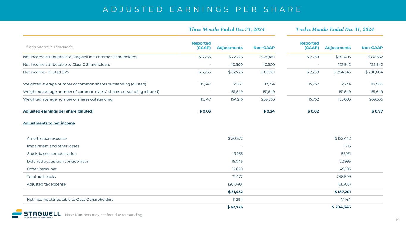 A D J US T E D E A R N I N G S P E R S H A R E截至2024年12月31日止三个月截至12月31日止十二个月,2024年报告(GAAP)调整非GAAP报告(GAAP)调整非GAAP归属于Stagwell公司普通股股东的净利润3,235美元22,226美元25,461美元2,259美元80,403美元82,662美元归属于C类股东的净利润-40,50040,500-123,942123,942净收入–稀释后每股收益3,235美元62,726美元65,961美元2,259美元204,345美元206,604股加权平均已发行普通股股数(稀释后)115,1472,567117,714115,7522,234117,986股加权平均已发行普通股股数(稀释后)-151,649151,649-151,649151,649股加权平均已发行股数115,147154,216269,363115,752153,883269,635调整后每股收益(稀释后)0.03美元0.24美元0.02美元0.77美元调整净收益摊销费用30,572美元122,442美元减值和其他损失-1,715股票补偿13,23552,161递延收购对价15,04522,995其他项目,净额12,62049,196加回总额71,472248,509调整后税费(20,040)(61,308)51,432美元187,201美元归属于C类股东的净利润11,29417,144美元62,726美元204,34519美元和千股注:由于四舍五入,数字可能不够。