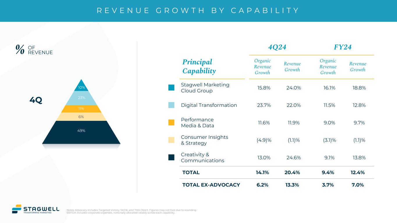 R E V E N U E G R O W T H B Y C A P A B I L I T Y Notes:Advocacy includes Targeted Victory,SKDK,and TMA Direct。由于四舍五入,数字可能无法实现。EBITDA包括公司费用,名义上按比例分配给每种能力。4Q24FY24主要能力有机收入增长收入增长有机收入增长收入增长Stagwell营销云集团15.8% 24.0% 16.1% 18.8%数字化转型23.7% 22.0% 11.5% 12.8%绩效媒体和数据11.6% 11.9% 9.0% 9.7%消费者洞察和战略(4.9)%(1.1)%(3.1)%(1.1)%创意和传播13.0% 24.6% 9.1% 13.8%合计14.1% 20.4% 9.4% 12.4%合计EX-ADVOCACY 6.2% 13.3% 3.7% 7.0% %收入占比Q4 10% 23% 11% 6% 49%