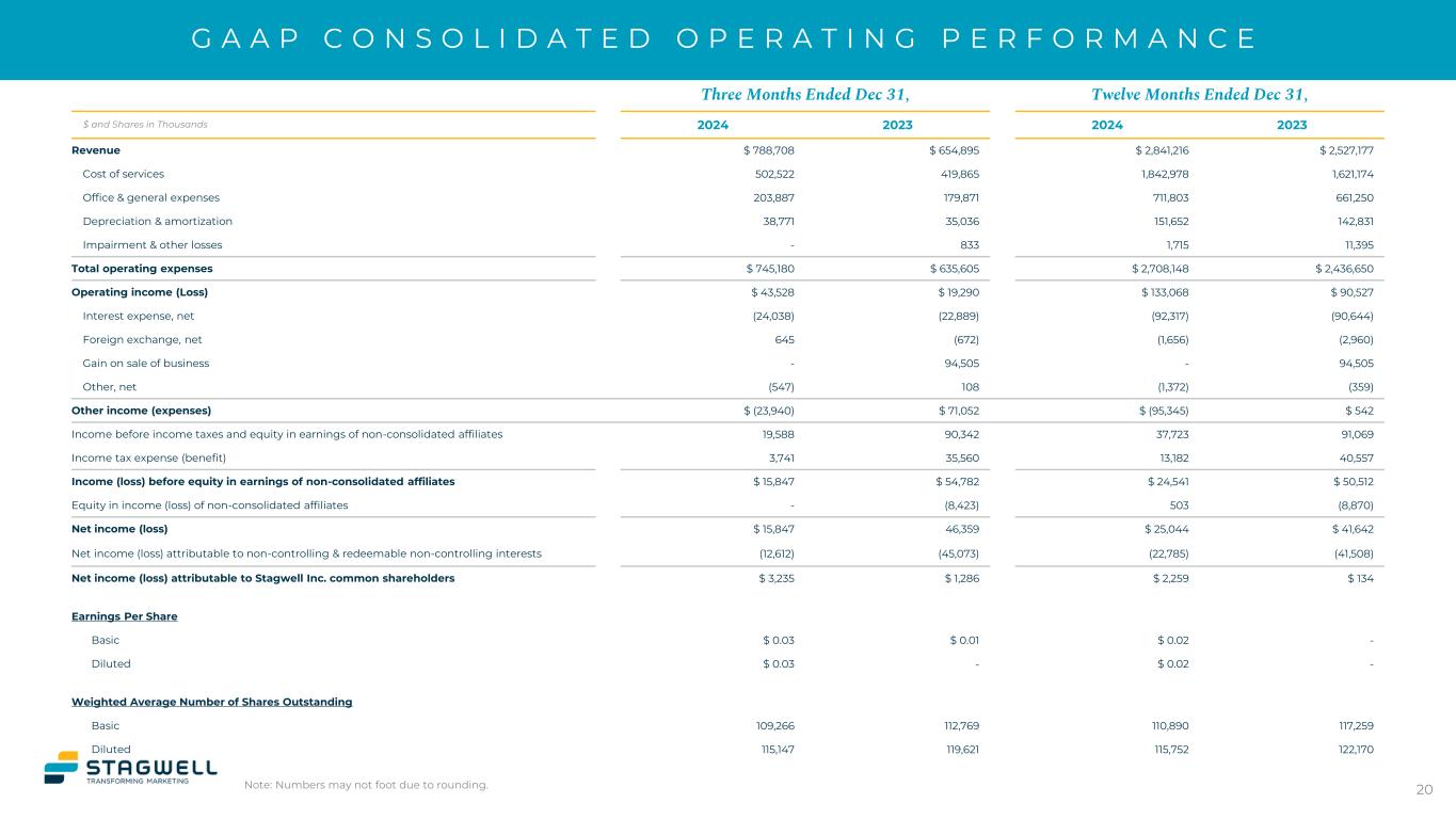G A A P C O N S O L I D A T E D O P E R A T I N G P E R F O R M A N C E注:由于四舍五入,数字可能无法实现。20美元和以千为单位的股份截至12月31日的三个月,截至2024年12月31日的十二个月2023202320242023收入788,708美元654,895美元2,841,216美元2,527,177美元服务成本502,522419,8651,842,9781,621,174办公和一般费用203,887179,871711,803661,250折旧和摊销38,77135,036151,652142,831减值和其他损失-8331,71511,395总营业费用745,180美元635,605美元2,708,148美元2,436,650美元营业收入(亏损)43,528美元19,290美元133,068美元90,527美元利息支出净额(24,038净额645(672)(1,656)(2,960)出售业务收益-94,505-94,505其他,净额(547)108(1,372)(359)其他收入(支出)$(23,940)$ 71,052 $(95,345)$ 542所得税前收入和非合并关联公司收益中的权益19,58890,34237,72391,069所得税费用(收益)3,74135,56013,18240,557收入(亏损)非合并关联公司收益前权益$ 15,847 $ 54,782 $ 24,541 $ 50,512非合并关联公司收益(亏损)权益-(8,423)503(8,870)净收入(亏损)$ 15,84746,359 $ 25,044 $ 41,642归属于非控股和可赎回非控股权益的净收入(亏损)(12,612)(45,073)(22,785)(41,508)归属于Stagwell Inc.普通股股东的净收入(亏损)$ 3,235 $ 1,286 $ 2,259 $ 134每股收益基本$ 0.03 $ 0.01 $ 0.02-稀释后$ 0.03-$ 0.02-加权平均已发行股份数基本109,266112,769110,890117,259稀释后115,147119,621115,752122,170