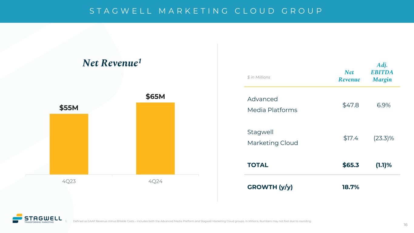 S T A G W E L L M A R K E T I N G C L O U D G R O U P 16净收入11。定义为GAAP收入减去可结算成本–包括Advanced Media Platform和Stagwell营销云集团。以百万计。由于四舍五入,数字可能无法实现。净收入调整后EBITDA利润率Advanced Media Platforms $ 47.86.9% Stagwell Marketing Cloud $ 17.4(23.3)% Total $ 65.3(1.1)% Growth(y/y)18.7% $ 55M $ 6500万4Q23 4Q24百万美元