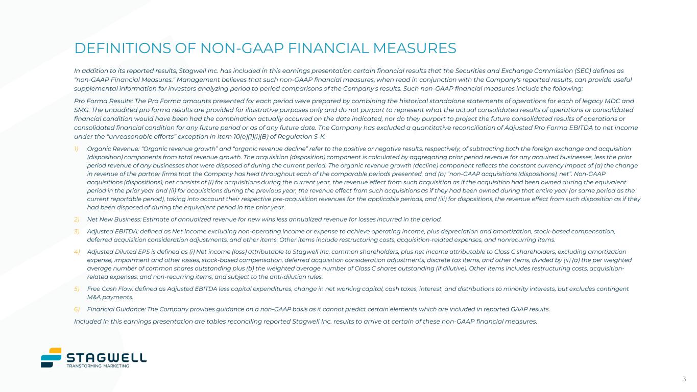 NON-GAAP财务指标3的定义除了报告的业绩外,Stagwell Inc.还在本次收益报告中包含了某些财务业绩,美国证券交易委员会(SEC)将其定义为“非GAAP财务指标”。管理层认为,当与公司报告的业绩一起阅读时,此类非公认会计准则财务指标可以为投资者分析公司业绩的期间比较提供有用的补充信息。此类非公认会计原则财务指标包括以下各项:备考结果:每期呈报的备考金额是通过合并遗留的MDC和SMG各自的历史独立运营报表编制的。提供未经审计的备考业绩仅用于说明目的,并不旨在表示如果合并在所示日期实际发生,实际的综合经营业绩或综合财务状况将是什么,也不旨在预测任何未来期间或任何未来日期的未来综合经营业绩或综合财务状况。公司在S-K条例第10(e)(1)(i)(b)项的“不合理努力”例外情况下排除了调整后的备考EBITDA与净收入的量化对账。1)有机收入:“有机收入增长”和“有机收入下降”分别指从总收入增长中减去外汇和收购(处置)部分的正或负结果。收购(处置)部分的计算方法是汇总任何收购业务的前期收入,减去当期处置的任何业务的前期收入。有机收入增长(下降)部分反映了以下恒定货币影响:(a)公司在列报的每个可比期间持有的合作伙伴公司的收入变化,以及(b)“非公认会计原则收购(处置),净额”。非公认会计原则的收购(处置),净额包括(i)本年度的收购,此类收购产生的收入影响如同收购在上一年的同期内拥有;(ii)上一年度的收购,此类收购产生的收入影响如同它们在该整年(或与当前报告期间相同的期间)拥有,同时考虑到它们各自在适用期间的收购前收入,以及(iii)处置,此类处置产生的收益影响,就好像它们已在上一年的同期内处置一样。2)净新业务:估计新赢的年化收入减去期间发生的亏损的年化收入。3)调整后EBITDA:定义为扣除营业外收入或费用实现营业收入的净收入,加上折旧摊销、股票补偿、递延收购对价调整等项目。其他项目包括重组成本、收购相关费用、非经常性项目。4)调整后稀释每股收益定义为(i)归属于Stagwell Inc.普通股股东的净收入(亏损),加上归属于C类股东的净收入,不包括摊销费用、减值和其他损失、基于股票的补偿、递延收购对价调整、离散税项和其他项目,除以(ii)(a)每加权平均已发行普通股股数加上(b)已发行C类股加权平均数(如果摊薄)。其他项目包括重组成本、收购相关费用、非经常性项目,并受制于反稀释规则。5)自由现金流:定义为调整后EBITDA减去资本支出、净营运资本变化、现金税、利息以及对少数股东的分配,但不包括或有并购付款。6)财务指引:公司在非公认会计原则基础上提供指引,因为它无法预测报告的公认会计原则结果中包含的某些要素。本收益报告中包含一些表格,这些表格对报告的Stagwell公司业绩进行了调节,以得出其中某些非公认会计准则财务指标。