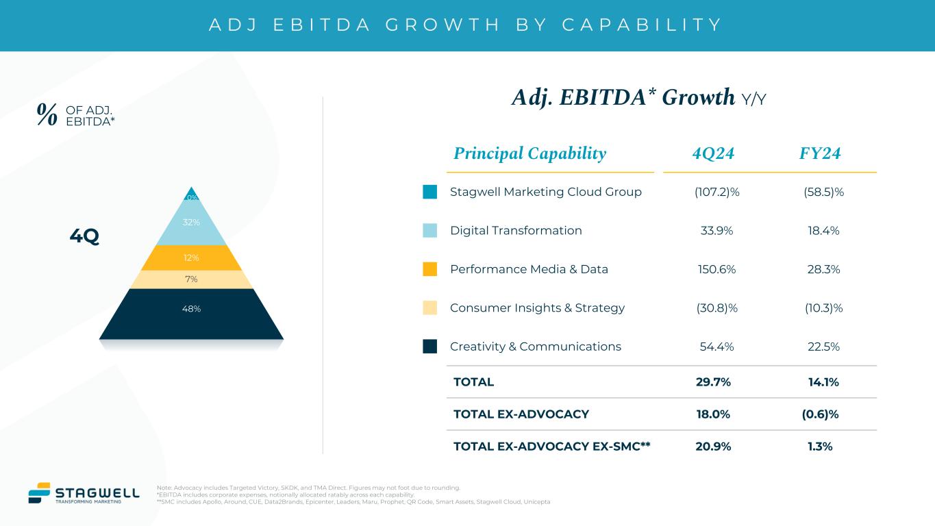 A D J E B I T D A G R O W T H B Y C A P A B I L I T Y注:倡导包括有针对性的胜利、SKDK和TMA直接。由于四舍五入,数字可能无法实现。*EBITDA包括公司费用,名义上按比例分配给每种能力。**SMC包括Apollo,Around,CUE,Data2Brands,Epicenter,Leaders,Maru,Prophet,QR Code,Smart Assets,Stagwell Cloud,Unicepta Principal Capability 4Q24 FY24丨Stagwell Stagwell Marketing Cloud Group(107.2)%(58.5)%数字化转型33.9% 18.4% Performance Media & Data 150.6% 28.3% Consumer Insights & Strategy(30.8)%(10.3)% Creativity & Communications 54.4% 22.5% Total 29.7% 14.1% Total EX-ADVOCACY 18.0%(0.6)% Total EX-ADVOCACY EX-SMC**ADJ.EBITDA的20.9% 1.3%%*第四季度调整后EBITDA*增长Y/Y 0% 32% 12% 7% 48%