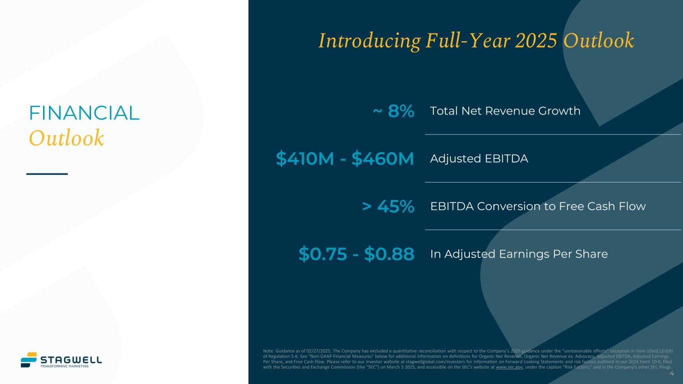 4财务展望介绍2025年全年展望~8%总净收入增长4.1亿美元-4.6亿美元调整后EBITDA > 45% EBITDA转换为自由现金流0.75美元-0.88美元调整后每股收益注:截至2025年2月27日的指引。根据S-K条例第10(e)(1)(i)(b)项中的“不合理努力”例外,公司已排除了与公司2025年指导有关的数量调节。有关有机净收入、有机净收入ex定义的更多信息,请参阅下文“非GAAP财务措施”。倡导、调整后EBITDA、调整后每股收益和自由现金流。请参阅我们的投资者网站stagwellglobal.com/investors,了解我们于2025年3月5日向美国证券交易委员会(“SEC”)提交的2024年10-K表格中概述的前瞻性陈述和风险因素的信息,这些信息可在SEC网站www.sec.gov上以“风险因素”为标题以及公司提交的其他SEC文件中查阅。