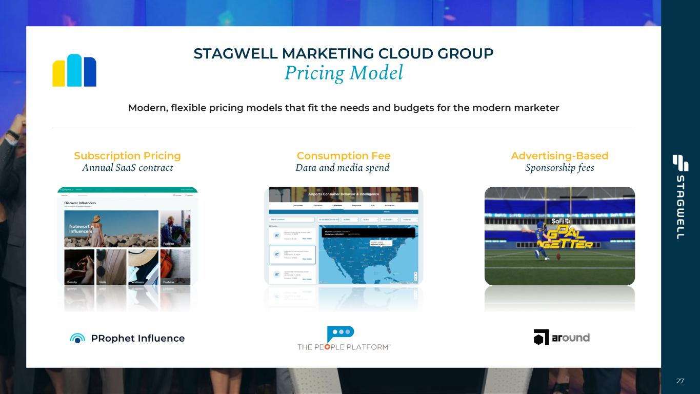 27 Stagwell Marketing Cloud Group定价模型现代、灵活的定价模型,适合现代营销人员的需求和预算订阅定价年度SaaS合同消费费用数据和媒体支出基于广告的赞助费用