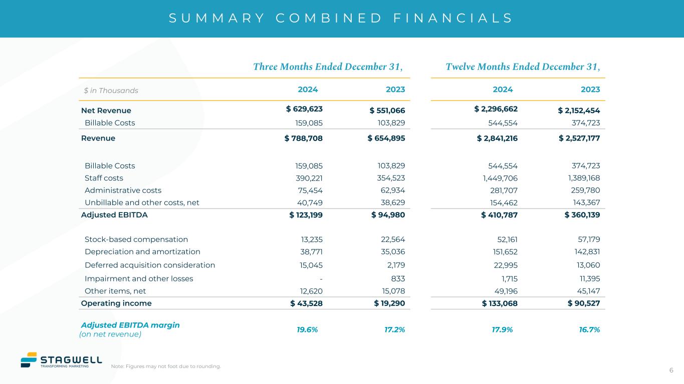 S U M M A R Y C O M B I N E D F I N A N C I A L S注:由于四舍五入,数字可能不够足。截至12月31日止三个月、截至2024年12月31日止十二个月202320242023净收入$ 629,623 $ 551,066 $ 2,296,662 $ 2,152,454可结算成本159,085103,829544,554374,723收入$ 788,708 $ 654,895 $ 2,841,216 $ 2,527,177可结算成本159,085103,829544,554374,723员工成本390,221354,5231,449,7061,389,168行政成本75,45462,934281,707259,780不可结算及其他成本,净额40,74938,629154,462143,367调整后EBITDA 123,199美元94,980美元410,787美元360,139美元股票补偿13,23522,56452,16157,179折旧和摊销38,77135,036151,652142,831递延收购对价15,0452,17922,99513,060减值和其他损失-8331,71511,395其他项目净额12,62015,07849,19645,147营业收入43,528美元19,290美元133,068美元90,527调整后EBITDA利润率(按净收入计算)19.6% 17.2% 17.9% 16.7% 6美元以千