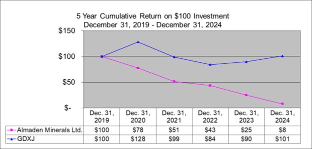 下图比较了自2019年12月31日以来投资于该公司普通股的100美元的累计股东总回报与该公司最近完成的五个财年的VanEck Vectors Junior Gold Miners ETF指数(“GDXJ”)的累计总回报。