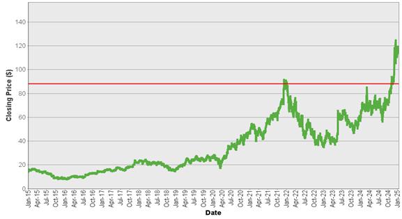 | Marvell Technology, Inc.基础股票–历史收盘价* 2015年1月2日至2025年1月16日 |