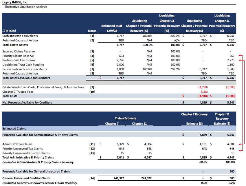 债务人及其顾问已就Legacy IMBDS,Inc.及其债务人附属公司的合并联合第11章清算计划和披露声明(本文件的披露声明部分,“披露声明”和第11章计划部分,“计划”,每一项都可能不时修改和/或修订,统称为“合并计划和披露声明”)编写了随附的假设清算分析,以评估该计划是否符合《破产法》第1129(a)(7)节规定的“最佳利益标准”。11该节要求,债权或利息的每一持有人将根据计划收到或保留这种债权或利息财产,其价值自计划生效之日起,至少相当于债务人根据《破产法》第7章被清算时持有人将收到或保留的价值。