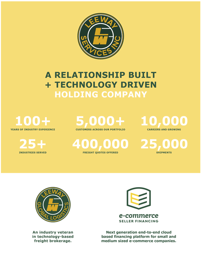 我们的货运经纪和物流业务通过我们的全资子公司LeeWay Transport,Inc.运营,该公司以前称为LeeWay Transportation,Inc.(“LeeWay Transport”)。我们的专业金融服务业务是通过我们的全资子公司LeeWay Capital,Inc.(“LeeWay Capital”)经营的。