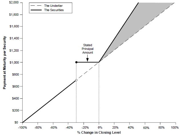 ↓到期兑付。到期时,如果最终水平大于初始水平,投资者将获得规定的本金金额加上杠杆上行支付。如果最终水平等于或低于初始水平,但大于或等于下行阈值水平,投资者将在到期时仅获得规定的本金金额。然而,如果最终水平低于下行阈值水平,投资者将在证券期限内基础证券水平每下降1%损失1%。在这种情况下,到期偿付将大大低于规定的本金金额,可能为零。