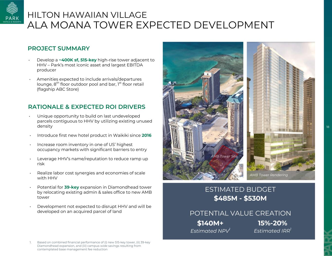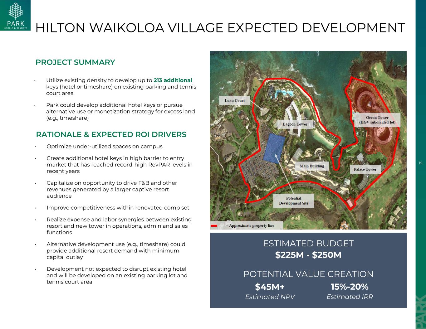 18 HILTON Hawaiian Village ALA MOANA Tower预期开发•开发一座约400k sF、515键的高层塔楼,毗邻HHV –公园最具标志性的资产和最大的EBITDA生产商•设施预计包括到达/离开休息室、8层室外游泳池和酒吧,1楼零售(旗舰ABC店)•利用现有未使用密度,利用与HHV相邻的最后一个未开发地块建立独特机会•自2016年以来在威基基推出首个新酒店产品•在美国入住率最高的市场之一增加客房库存,进入壁垒显着•利用HHV的名称/声誉来降低爬坡风险•与HHV实现劳动力成本协同效应和规模经济•通过将现有的行政和销售办公室搬迁到新的AMB塔,在Diamondhead塔进行39键扩展的潜力•开发预计不会扰乱HHV并将在收购的地块上开发项目概要理由&预期投资回报率驱动因素1。基于(i)新的515键塔、(ii)39键Diamondhead扩展和(iii)预期的基础管理费减少导致的校园范围内节省1.4亿美元+估计NPV1 15%-20 %估计IRR1估计预算4.85亿美元-5.3亿美元的综合财务业绩