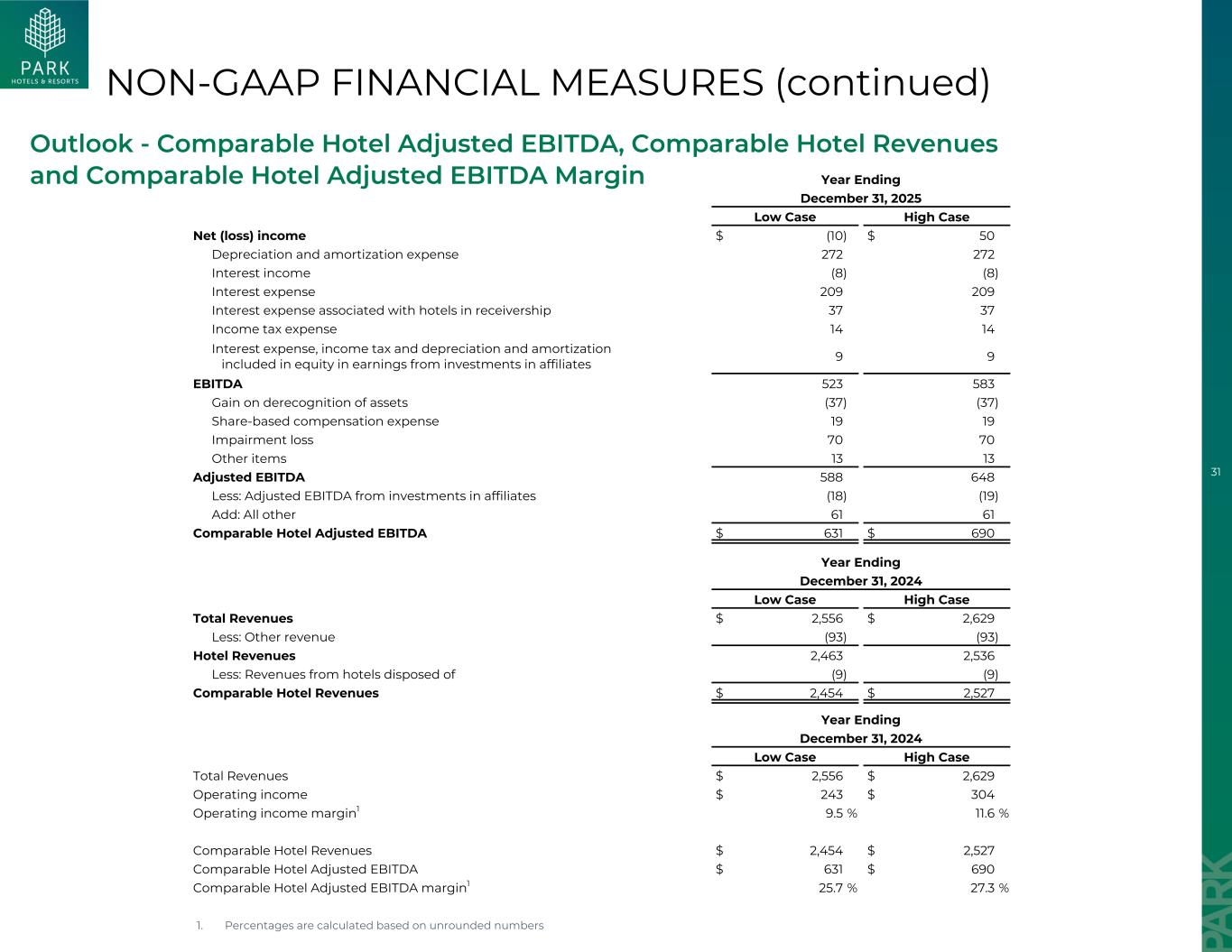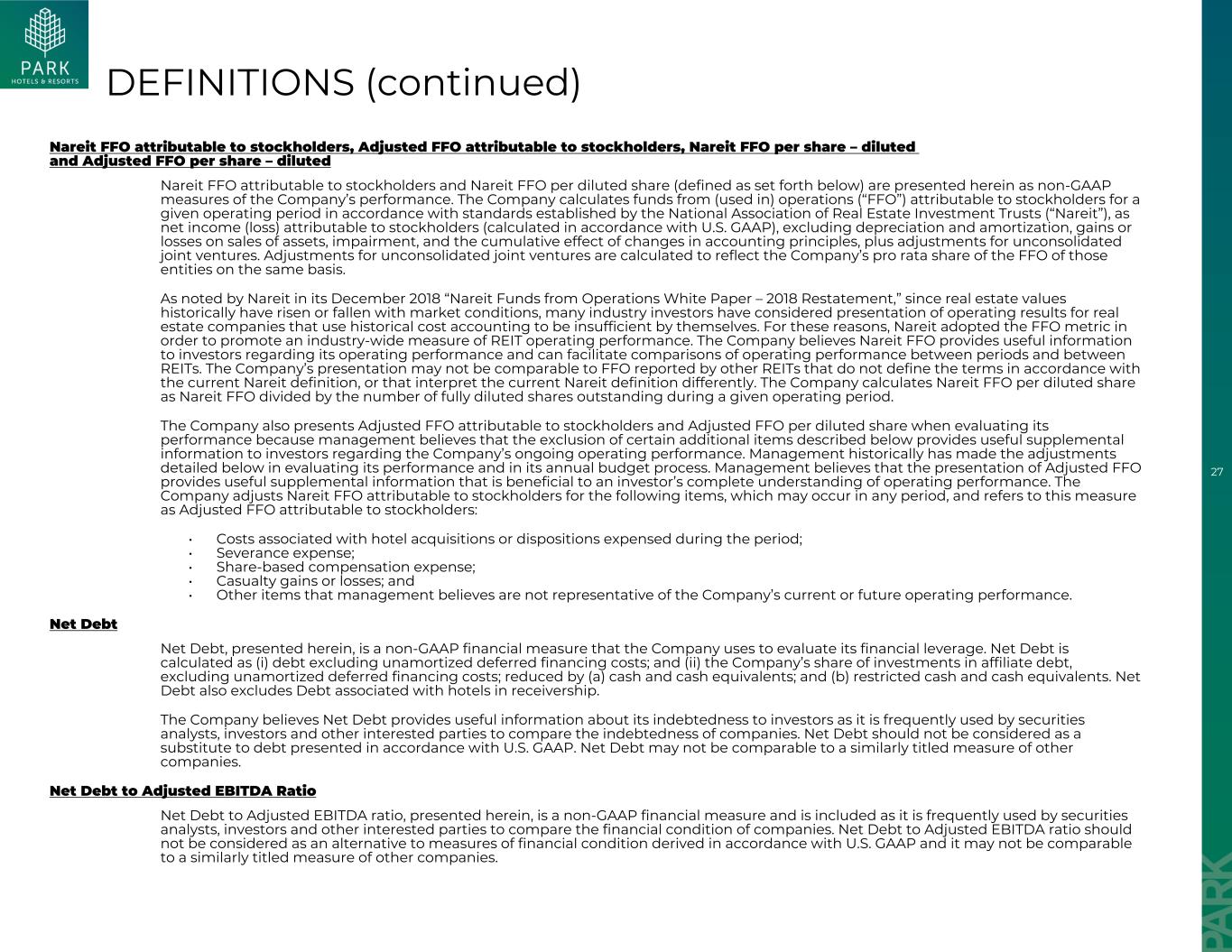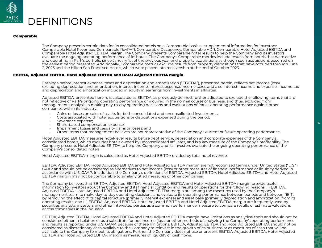 26可比公司在可比基础上提供其合并酒店的某些数据,作为投资者的补充信息:可比酒店收入、可比RevPAR、可比入住率、可比ADR、可比酒店调整后EBITDA和可比酒店调整后EBITDA利润率。公司提供可比酒店业绩,以帮助公司及其投资者评估其酒店的持续经营业绩。该公司的可比指标包括自上一年1月1日以来在Park的投资组合中活跃和运营的酒店的结果,以及似乎此类收购发生在最早报告期间的物业收购。此外,可比指标不包括截至2025年6月2日发生的财产处置结果以及2023年10月底被置于接管状态的希尔顿旧金山酒店。EBITDA、调整后EBITDA、酒店调整后EBITDA和酒店调整后EBITDA利润率未计利息支出、税项和折旧及摊销前的利润(“EBITDA”),在此列报,反映了不包括折旧和摊销、利息收入、利息支出、所得税以及利息收入和费用、所得税和折旧及摊销在内的净收益(亏损),包括在附属公司投资收益中的权益中。此处列出的调整后EBITDA按先前定义的EBITDA计算,进一步调整以排除以下不反映Park持续经营业绩或在正常业务过程中发生的项目,因此,管理层在针对行业内其他公司作出日常经营决策和评估Park的经营业绩时的分析被排除在外:•合并和未合并投资的资产出售收益或损失;•与酒店收购或处置相关的成本在该期间费用化;•遣散费;•以股份为基础的补偿费用;•减值损失和伤亡损益;•管理层认为不代表公司当前或未来经营业绩的其他项目。酒店调整后EBITDA衡量的是公司合并酒店的还本付息、折旧和公司费用前的酒店层面业绩,其中不包括未合并关联公司拥有的酒店,是衡量公司盈利能力的关键指标。公司提出酒店调整后EBITDA,以帮助公司及其投资者评估公司合并酒店的持续经营业绩。酒店调整后EBITDA利润率的计算方法为酒店调整后EBITDA除以酒店总收入。EBITDA、调整后EBITDA、酒店调整后EBITDA和酒店调整后EBITDA利润率不是美国(“美国”)公认会计原则下的认可条款,不应被视为根据美国公认会计原则得出的净收入(亏损)或其他财务业绩或流动性衡量标准的替代方案。此外,该公司对EBITDA、调整后EBITDA、酒店调整后EBITDA和酒店调整后EBITDA利润率的定义可能无法与其他公司类似标题的衡量标准进行比较。公司认为,EBITDA、调整后EBITDA、酒店调整后EBITDA和酒店调整后EBITDA利润率为投资者提供了有关公司及其财务状况和经营业绩的有用信息,原因如下:(i)EBITDA、调整后EBITDA、酒店调整后EBITDA和酒店调整后EBITDA利润率属于公司管理团队通过从经营业绩中去除资本结构(主要是利息费用)和资产基础(主要是折旧和摊销)的影响,来做出日常经营决策和评估其期间之间和REITs之间的经营业绩的衡量标准;(ii)EBITDA,调整后的EBITDA、酒店调整后的EBITDA和酒店调整后的EBITDA利润率经常被证券分析师、投资者和其他感兴趣的各方用来作为一种常见的业绩衡量标准,用于比较行业内各公司的结果或估计估值。EBITDA、调整后EBITDA、酒店调整后EBITDA和酒店调整后EBITDA利润率作为分析工具存在局限性,不应孤立地考虑或替代净收入(亏损)或其他根据美国公认会计原则报告的公司经营业绩和结果的分析方法。由于这些限制,EBITDA、调整后EBITDA和酒店调整后EBITDA不应被视为公司可用于对其业务增长进行再投资的可自由支配现金或公司可用于履行其义务的现金计量。此外,公司不使用或列报EBITDA、调整后EBITDA、酒店调整后EBITDA和酒店调整后EBITDA利润率作为流动性或现金流量的衡量标准。定义