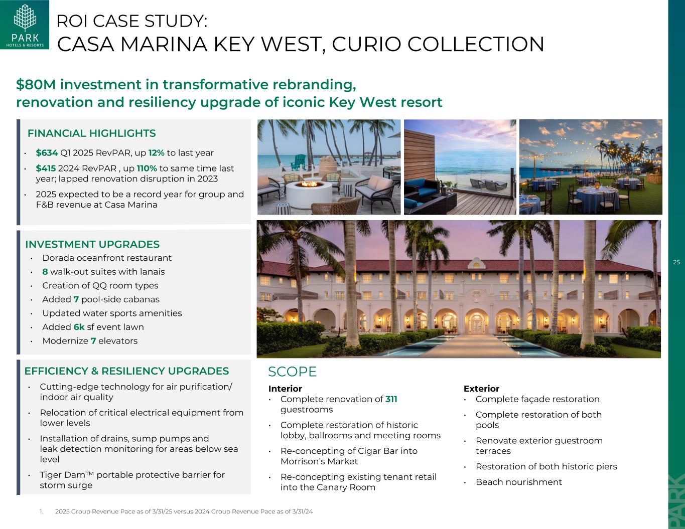25 •空气净化/室内空气质量的尖端技术•从较低水平迁移关键电气设备•安装排水沟、污水泵和海平面以下区域的泄漏检测监测•老虎大坝™风暴潮便携式防护屏障• Dorada海滨餐厅• 8间带阳台的步出式套房•创建QQ房型•新增7间池畔小屋•更新水上运动设施•新增6k SF赛事草坪• 7台电梯现代化ROI案例研究:投资8000万美元进行变革性品牌重塑,标志性的基韦斯特度假村改造和弹性升级效率和复原力提升财务亮点• 2025年第一季度RevPAR为634美元,比去年增长12% • 2024年度RevPAR为415美元,比去年同期增长110%;2023年翻修中断• 2025年预计将成为Casa Marina投资升级的团体和餐饮收入创纪录的一年内部• 311间客房完全翻修•历史悠久的大堂完全修复,舞厅和会议室•将Cigar Bar重新构想成Morrison的市场•将现有租户零售重新构想成Canary Room ScoPE外部•完全修复立面•完全修复两个游泳池•翻新外部客房露台•修复两个历史悠久的码头•修复海滩滋养CASA MARINA KEY WEST,CURIO系列1。截至3/31/25的2025年集团收入步伐对比截至3/31/24的2024年集团收入步伐