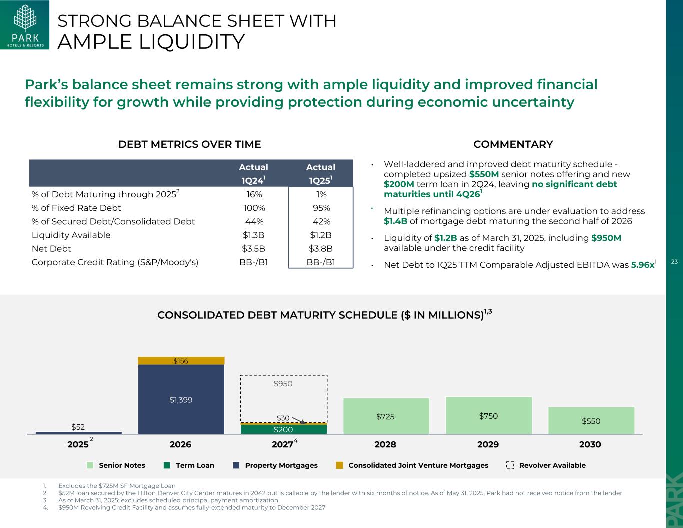 23流动性充裕的强劲资产负债表Park的资产负债表保持强劲,流动性充裕,增长的财务灵活性得到提高,同时在经济不确定期间提供保护•梯次完善且债务到期时间表得到改善-在2Q24完成了规模扩大的5.5亿美元优先票据发行和新的2亿美元定期贷款,在4Q261之前没有留下重大债务到期•正在评估多个再融资方案,以解决2026年下半年到期的1.4B美元抵押债务•截至2025年3月31日的流动性为1.2B美元,包括信贷安排下可用的9.5亿美元•到25年第一季度的净债务TTM可比调整后EBITDA为5.96x1合并债务到期时间表(百万美元)1,3债务指标随时间推移评注实际实际1Q241 1Q251 %到20252年到期的债务16%1%固定利率债务100% 95%有担保债务/合并债务44% 42%可用流动性$ 1.3B $ 1.2B净债务$ 3.5B $ 3.8B公司信用评级(丨标普丨/穆迪)BB-/B1 BB-/B1 $ 725 $ 750 $ 550 $ 200 $ 52 $ 1,399 $ 156 $ 30 $ 950优先票据不包括7.25亿美元的顺丰抵押贷款2。由丹佛市中心希尔顿酒店担保的5200万美元贷款将于2042年到期,但贷款人可提前六个月通知赎回。截至2025年5月31日,Park未收到贷款人3的通知。截至2025年3月31日;不包括预定本金支付摊销4。9.5亿美元的循环信贷安排,并假设完全延长期限至2027年12月24