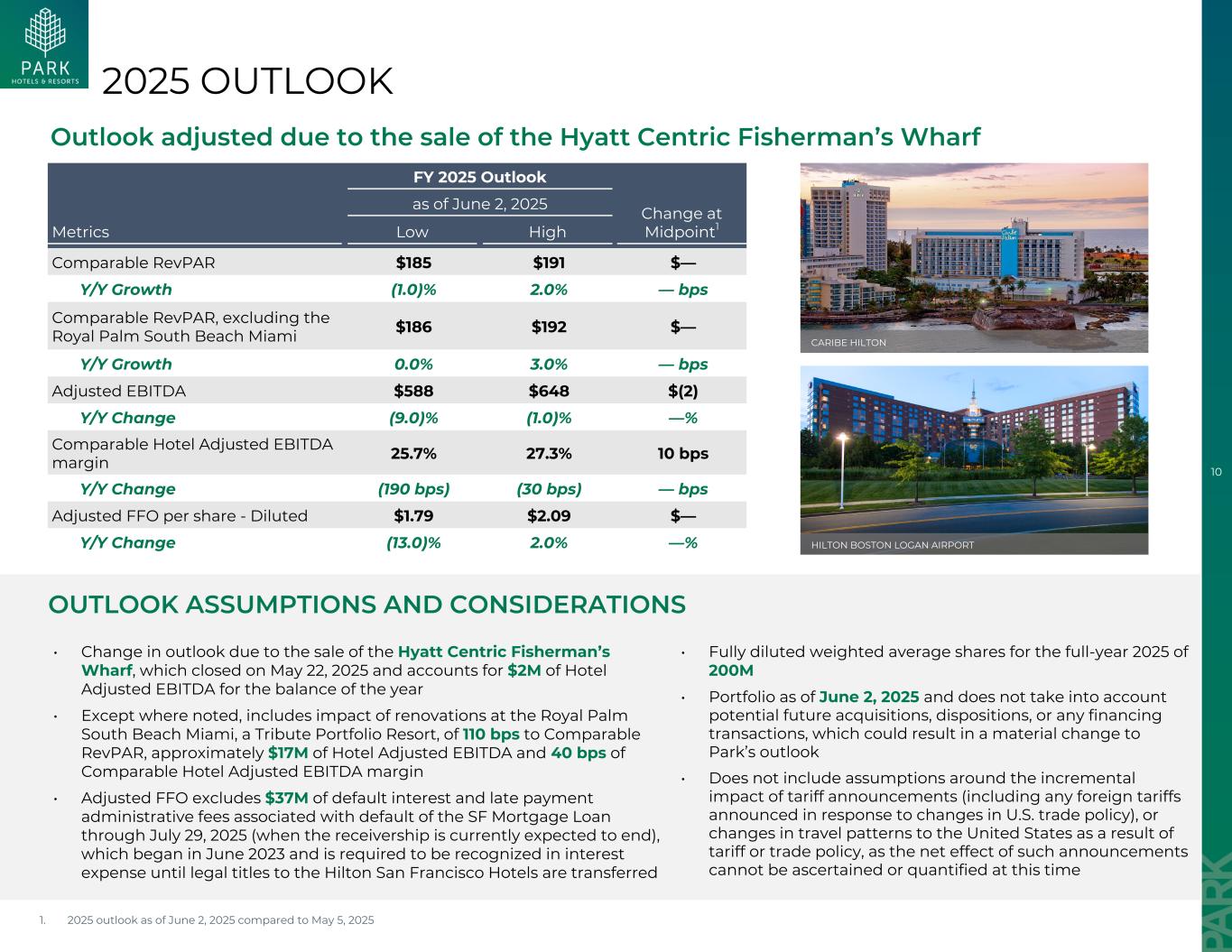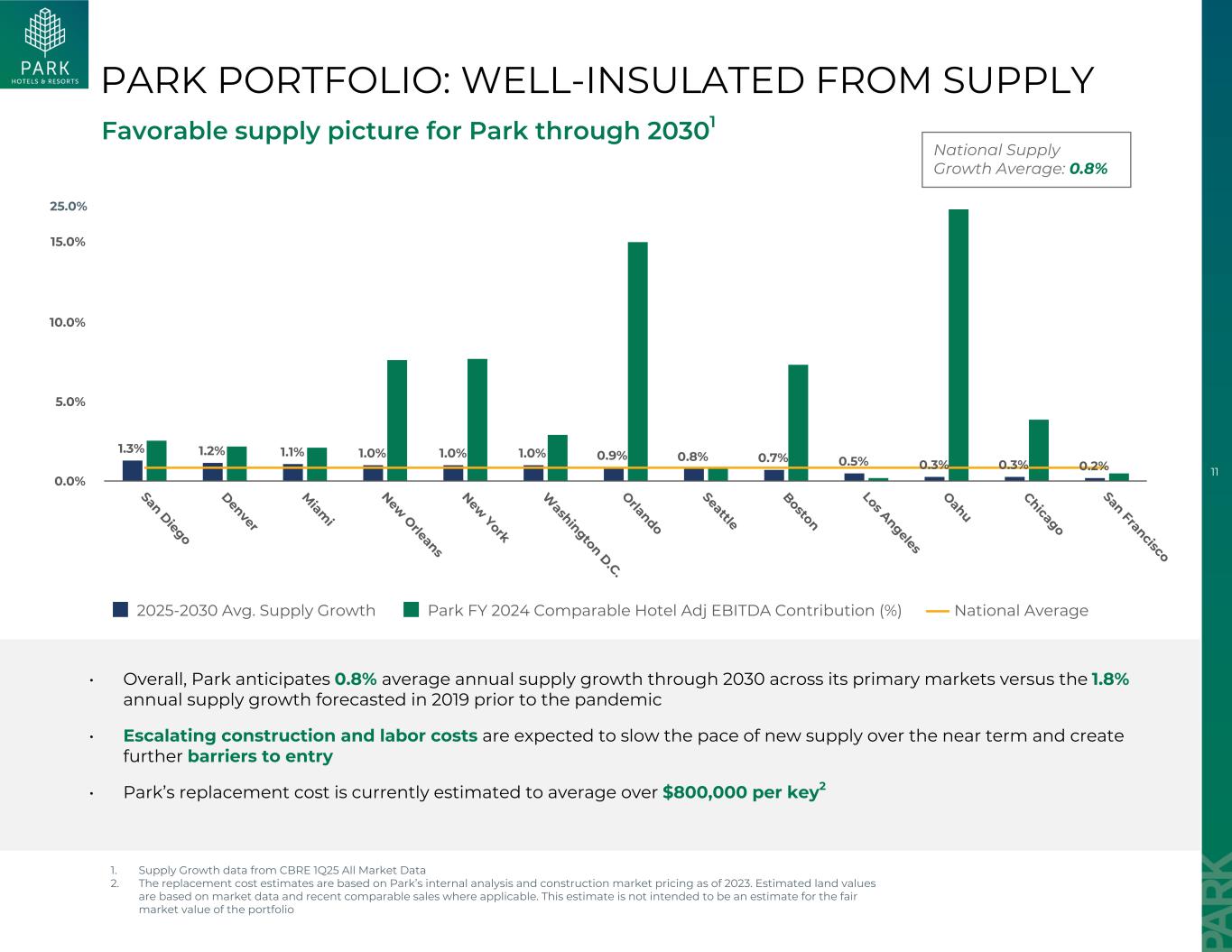 10因出售凯悦中心渔人码头2025年展望展望假设和考虑因素而调整的展望截至2025年6月2日的2025财年展望变化中点1Metrics低高可比RevPAR185美元191美元—同比增长(1.0)% 2.0% — bps可比RevPAR,不包括迈阿密皇家棕榈岛南滩186美元192美元—同比增长0.0% 3.0% — bps调整后EBITDA 588美元648美元(2)同比变化(9.0)%(1.0)% —%可比酒店调整后EBITDA利润率25.7% 27.3% 10个基点Y/Y变化(190个基点)(30个基点)— bps调整后每股FFO-稀释后1.79美元2.09美元—同比变化(13.0)% 2.0% —% •由于出售凯悦中心渔人码头而导致前景变化,该码头于2025年5月22日结束,占本年度余额酒店调整后EBITDA的200万美元•除非另有说明,包括Tribute Portfolio度假村Miami Royal Palm South Beach的翻修对可比RevPAR的影响为110个基点、约1700万美元的酒店调整后EBITDA和40个基点的可比酒店调整后EBITDA利润率•调整后的FFO不包括与截至2025年7月29日(目前预计接管结束时)的顺丰抵押贷款违约相关的3700万美元违约利息和滞纳金管理费用,开始于2023年6月,要求在转让旧金山希尔顿酒店的合法所有权之前确认为利息费用• 2025年全年完全稀释的加权平均股份2亿•截至2025年6月2日的投资组合,不考虑未来潜在的收购、处置或任何融资交易,这可能导致Park的前景发生重大变化•不包括围绕关税宣布的增量影响(包括因应美国贸易政策变化而宣布的任何外国关税)的假设,或因关税或贸易政策导致赴美旅行模式发生变化,因为目前无法确定或量化此类公告的净影响1。与2025年5月5日相比,截至2025年6月2日的2025年展望加勒比希尔顿希尔顿波士顿洛根机场