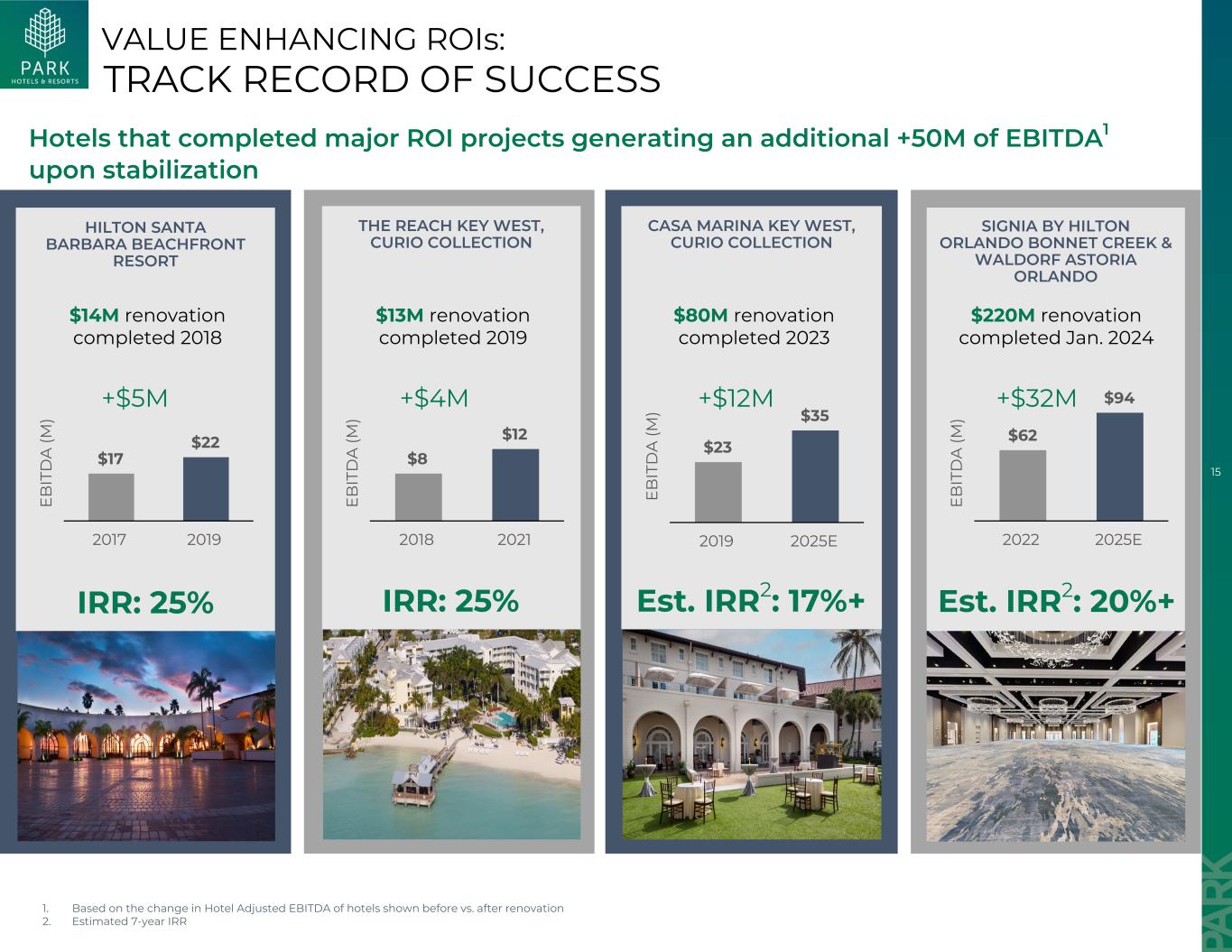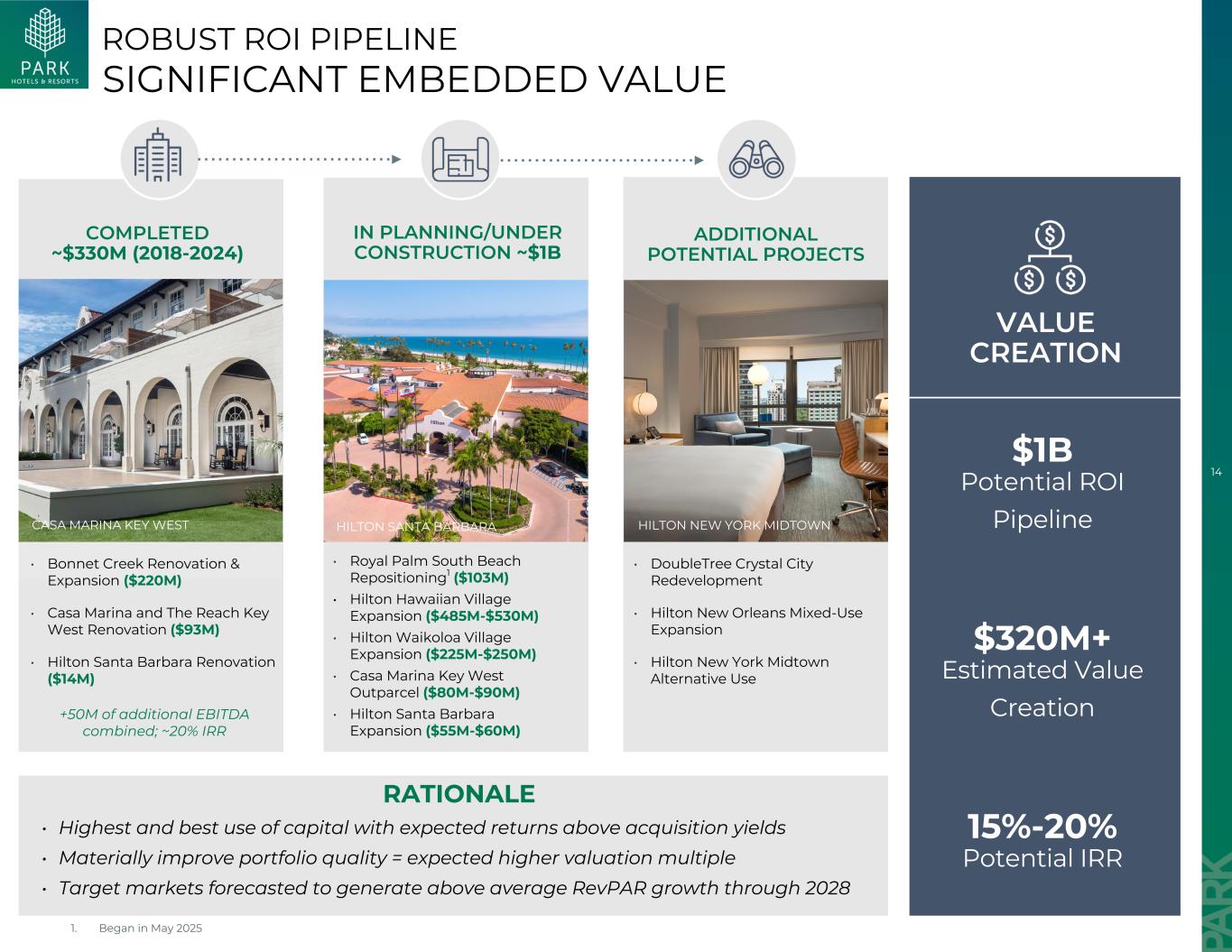 14个已完成~3.3亿美元(2018-2024年)的规划/在建项目~10亿美元的额外潜在项目价值创造10亿美元的潜在ROI管道3.2亿美元+估计价值创造15%-20 %潜在IRR显着嵌入式价值稳健ROI管道HILTON New York MIDTOWN • Bonnet Creek翻新和扩建(2.2亿美元)• Casa Marina和Reach Key West改造(9300万美元)• Hilton Santa Barbara改造(1400万美元)+ 5000万的额外EBITDA总和;~20% IRR • Royal Palm South Beach重新定位1(1.03亿美元)• Hilton Hawaiian Village扩建(4.85亿美元至5.3亿美元)• Hilton Waikoloa Village扩建(2.25亿美元至2.5亿美元)• Casa Marina Key West Outparcel(8000万美元至9000万美元)• Hilton Santa Barbara扩建(5500万美元至6000万美元)• DoubleTree Crystal City再开发• Hilton New Orleans混合用途扩建• Hilton New York Midtown替代用途希尔顿Santa Barbaracasa Marina Key West RATIONALE •最高并以高于收购收益率的预期回报最佳利用资本•大幅改善投资组合质量=预期更高的估值倍数•预计到2028年目标市场将产生高于平均水平的RevPAR增长1。2025年5月开始