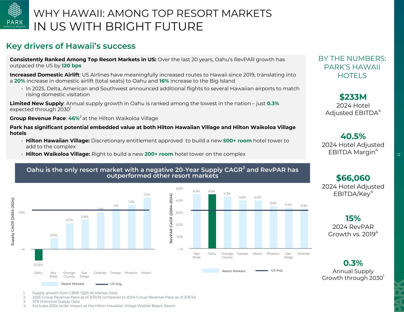 11 •总体而言,Park预计到2030年其主要市场的年均供应量将增长0.8%,而大流行前2019年预测的年供应量将增长1.8% •不断升级的建设和劳动力成本预计将在短期内减缓新供应的步伐,并为进入创造进一步的障碍• Park的重置成本目前估计平均为每个key2超过800,000美元Park portfolio:从供应1.3% 1.2% 1.1% 1.0% 1.0% 1.0% 1.0% 0.9% 0.8% 0.7% 0.5% 0.3% 0.3% 0.2% 2025-2030年平均供应增长公园2024财年可比酒店调整后EBITDA贡献(%)全国平均水平圣地亚哥丹佛M iam i新奥尔良纽约W ashington D.C.奥兰多西雅图波士顿洛杉矶欧胡岛芝加哥旧金山0.0% 5.0% 10.0% 15.0% 1。供应增长数据来自CBRE 25年第一季度所有市场数据2。重置成本估算基于园区内部分析和截至2023年的建设市场定价。估计土地价值基于市场数据和适用的近期可比销售额。这一估计并不是对投资组合公平市场价值的估计全国供应增长平均:0.8%对园区有利的供应情况到2030125.0%