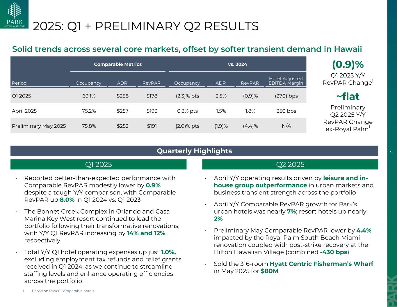 9个可比指标与2024年期间入住率ADR RevPAR入住率ADR RevPAR酒店调整后EBITDA利润率2025年第一季度69.1% $ 258 $ 178(2.3)% pts 2.5%(0.9)%(270)bps 2025年4月75.2% $ 257 $ 1930.2% pts 1.5% 1.8% 250 bps 2025年5月初步75.8% $ 252 $ 191(2.0)% pts(1.9)%(4.4)% N/a2025:Q1 +初步Q2结果几个核心市场的稳健趋势,被夏威夷的短暂需求疲软所抵消•报告的业绩好于预期,尽管同比比较艰难,但可比RevPAR小幅下降0.9%,与2023年第一季度相比,2024年第一季度的可比RevPAR增长8.0% •奥兰多的Bonnet Creek综合体和Casa Marina Key West度假村在进行变革性改造后继续引领投资组合,第一季度RevPAR同比分别增长14%和12% •第一季度酒店总运营费用同比仅增长1.0%,不包括2024年第一季度收到的就业税退款和救济赠款,随着我们继续精简人员配置水平并提高整个投资组合的运营效率• 4月同比经营业绩由休闲和内部集团在城市市场的优异表现推动整个投资组合的业务短暂实力• Park的城市酒店4月同比可比RevPAR增长近7%;度假酒店增长近2% •初步5月可比RevPAR下降4.4%,受迈阿密皇家棕榈南海滩翻新以及希尔顿夏威夷村罢工后复苏的影响(合并-430个基点)• 2025年5月以8000万美元的价格出售了拥有316间客房的Hyatt Centric渔人码头2025年第一季度2025年第二季度(0.9)% 2025年第一季度同比RevPAR变化1~持平初步2025年第二季度同比RevPAR变化前皇家棕榈1季度亮点1。基于Parks的可比酒店